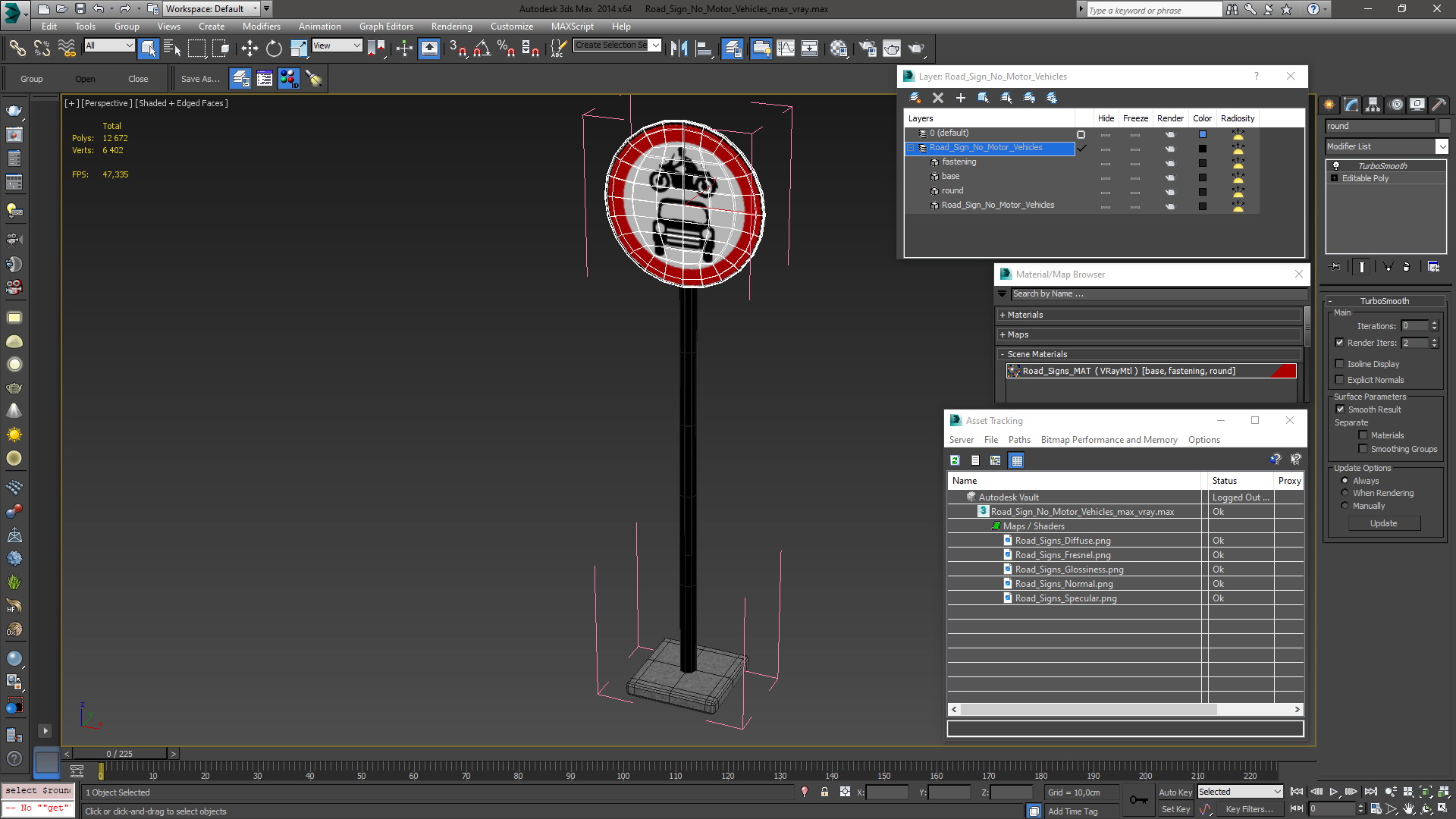 Road Sign No Motor Vehicles is a high quality, photo real 3d model that will enhance detail and realism to any of your rendering projects. The model has a fully textured, detailed design that allows for close-up renders, and was originally modeled in 3ds Max 2020 and rendered with V-Ray. Renders have no postprocessing!