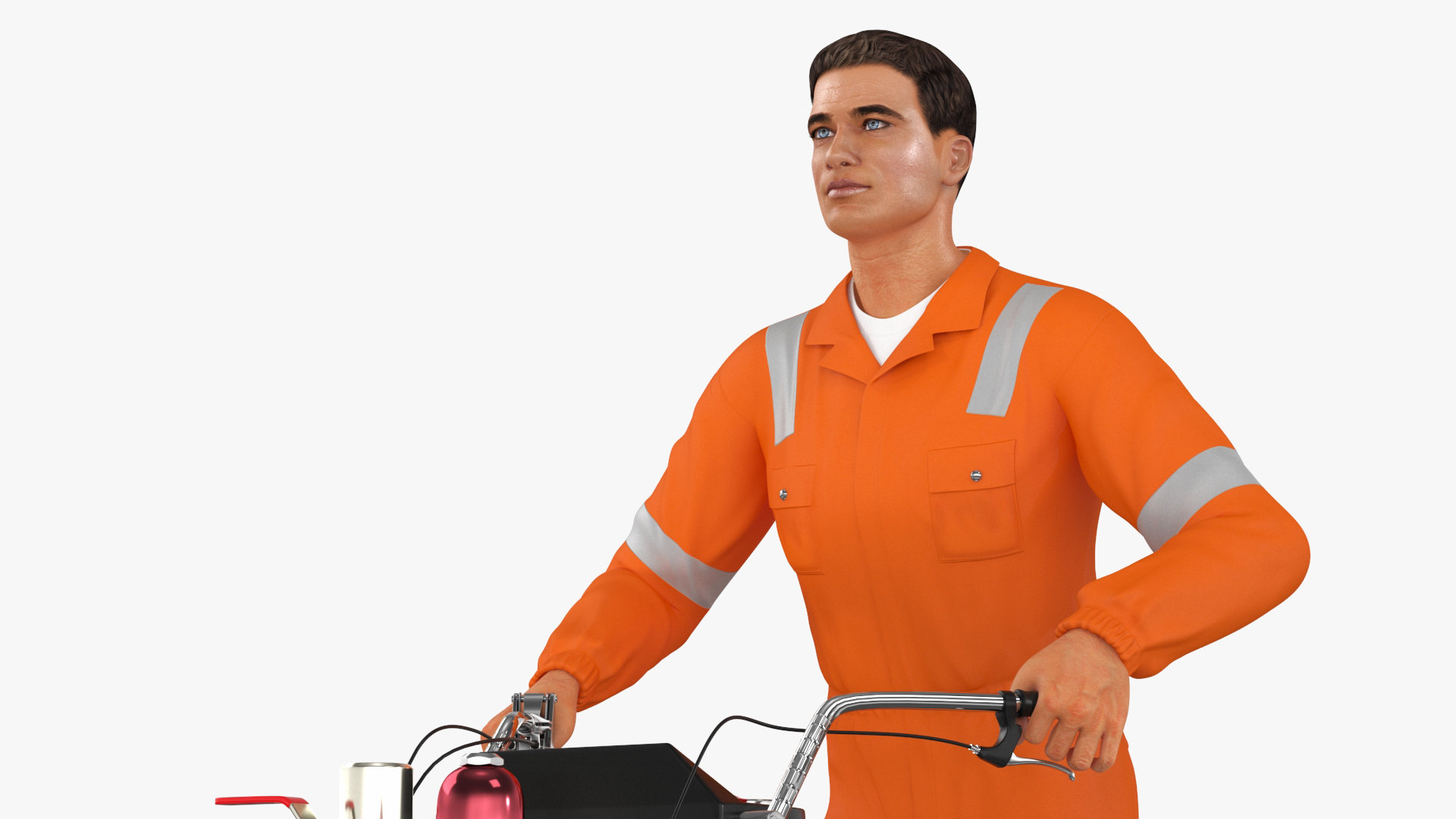 Road Worker with Cold Paint Line Striper is a three-dimensional model of road worker character with hydraulic road line marking machine which is a road stripper wheeled device which is designed to airports, car parks, and wide range of other applicators.