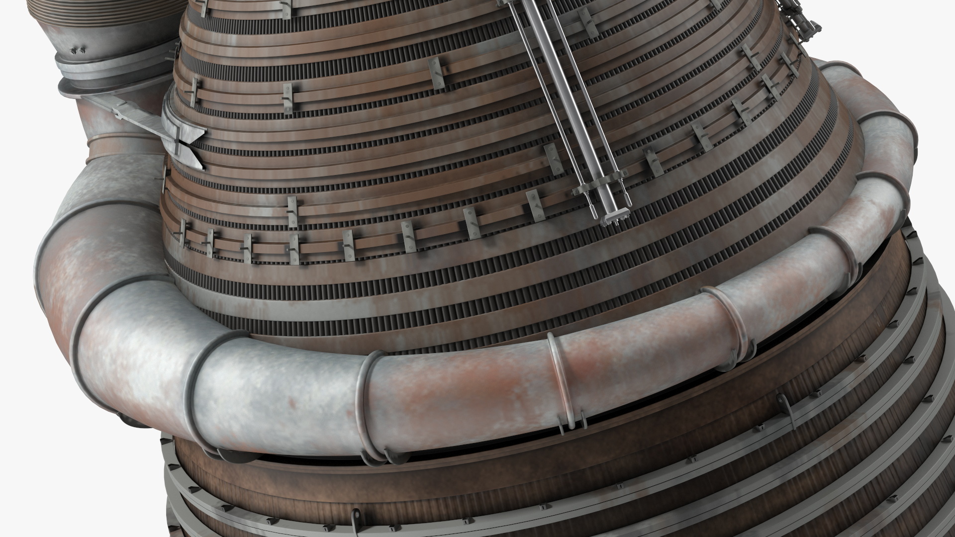 This model features an elaborate design with precision-engineered components, including numerous interconnected pipes, fuel injectors, and exhaust nozzles, all depicted in a highly detailed and realistic manner. The intricate piping and mechanical details reflect the sophisticated technology used in rocket propulsion systems, making it ideal for high-fidelity visualizations and educational purposes related to aerospace engineering and space exploration.