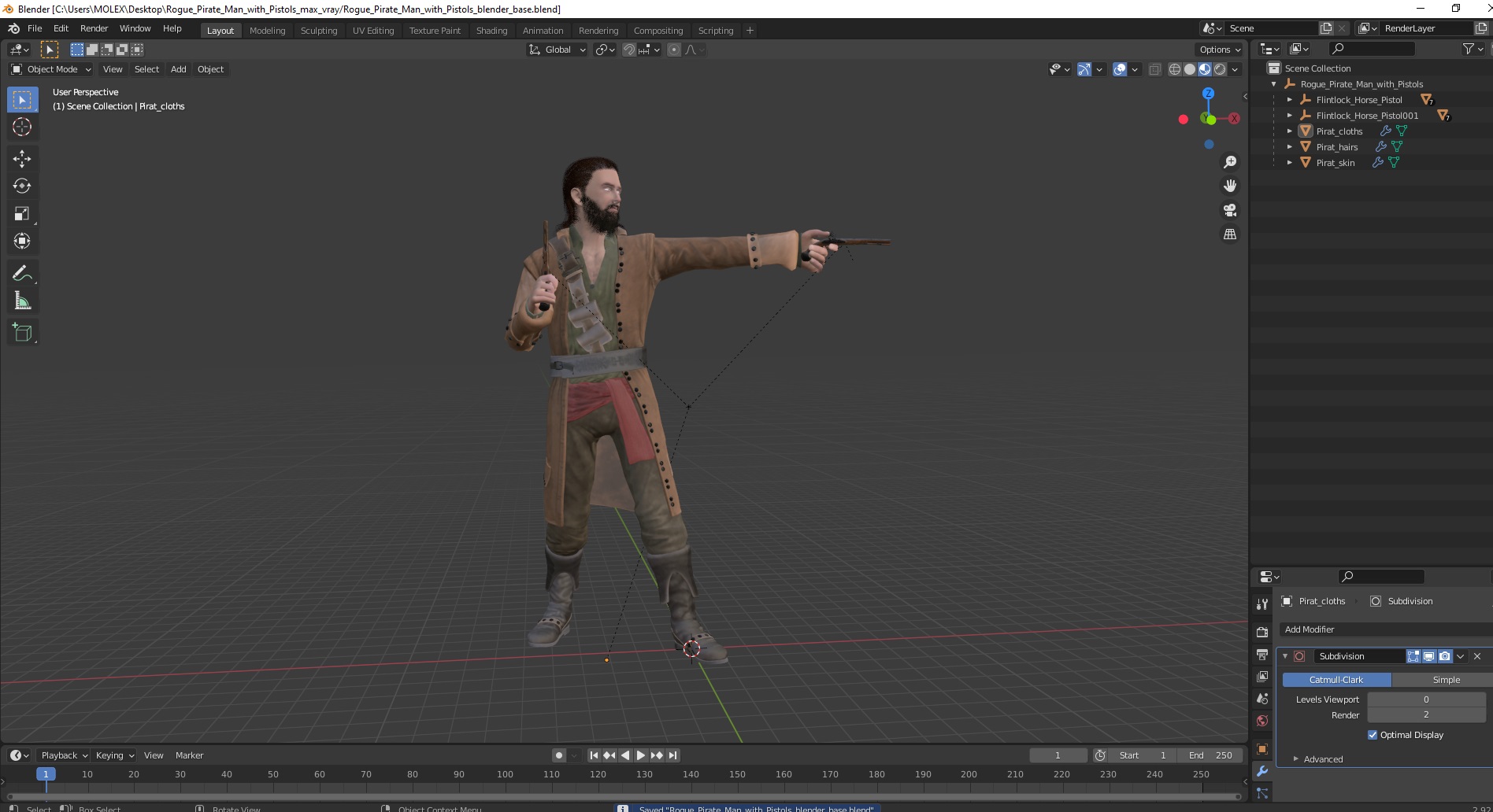 Rogue Pirate Man with Pistols is a high quality, photo real 3d model that will enhance detail and realism to any of your rendering projects. The model has a fully textured, detailed design that allows for close-up renders, and was originally modeled in 3ds Max 2020 and rendered with V-Ray. Renders have no postprocessing!