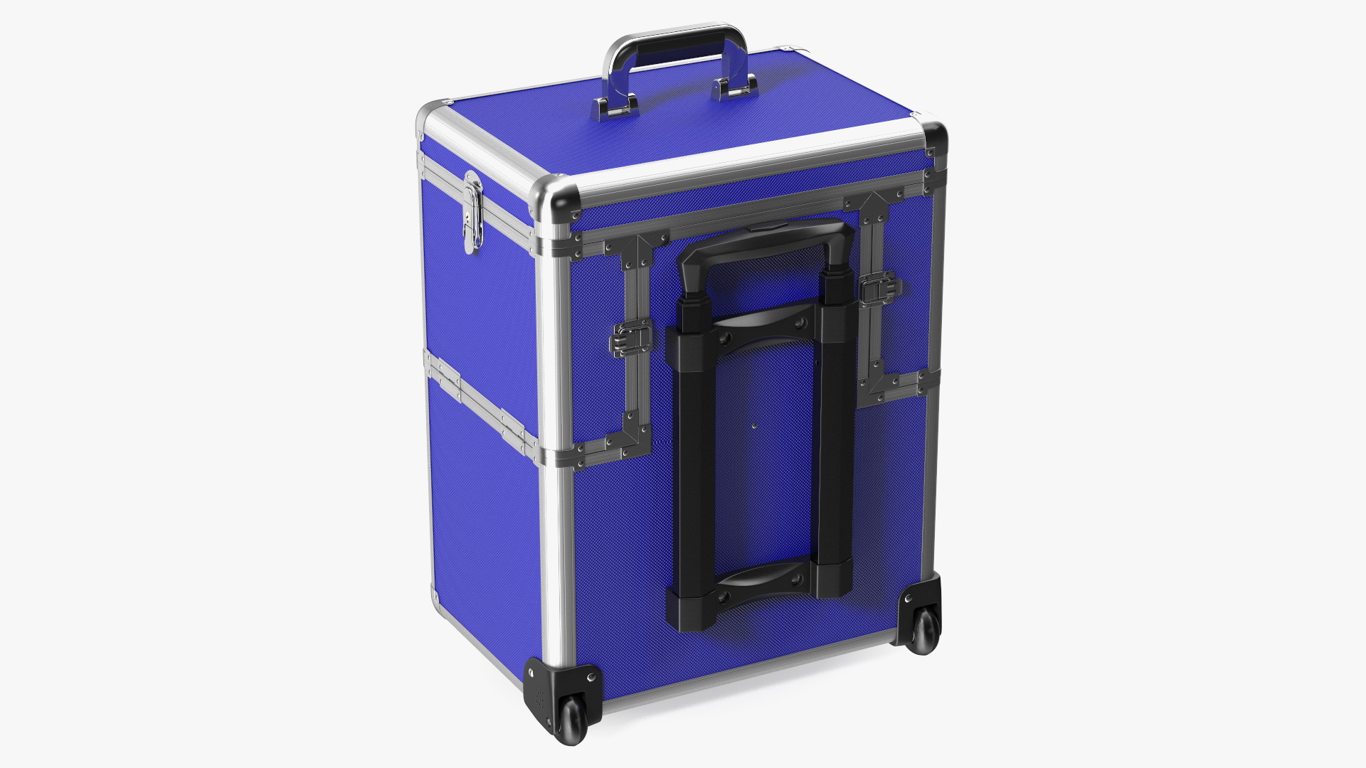 Rolling Makeup Case Folded Blue is a three-dimensional model of a professional, lockable trolley-shaped cosmetic case with wheels (rollings).