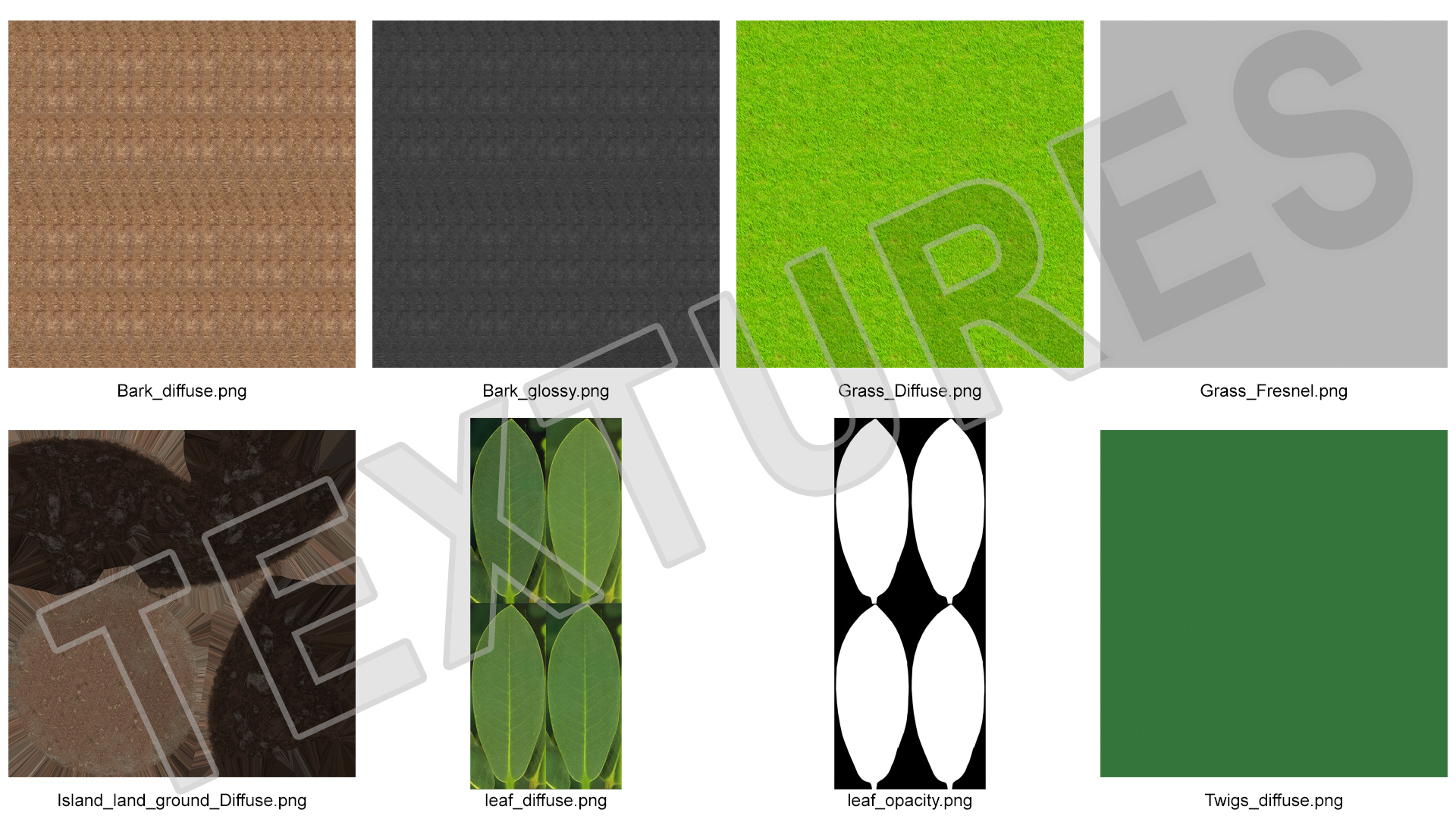 All textures and materials are included and mapped. (All colors can be easily modified.)