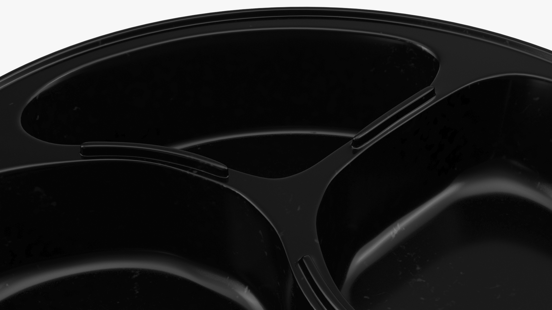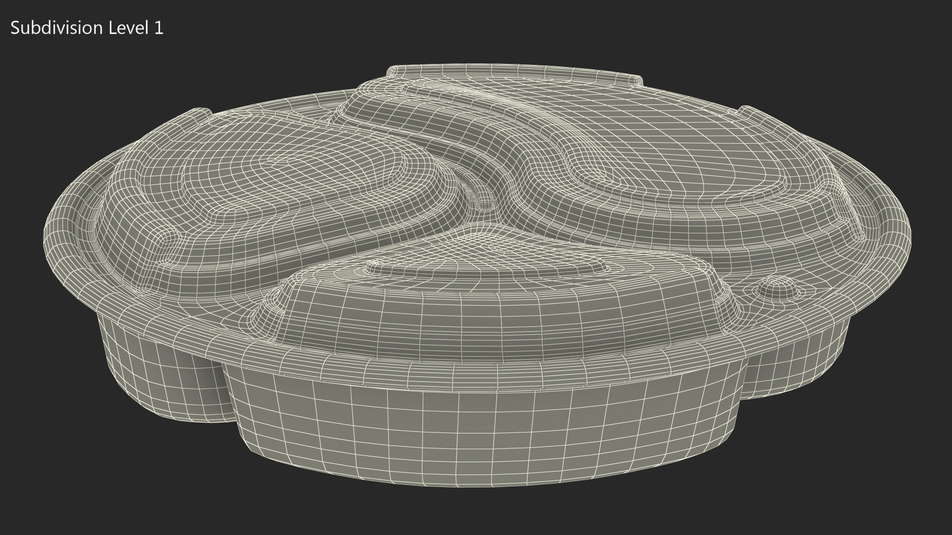 Round Takeout Food Container with 3 Compartments and Lid is a three-dimensional model of a meal prep container which is reusable food packaging.