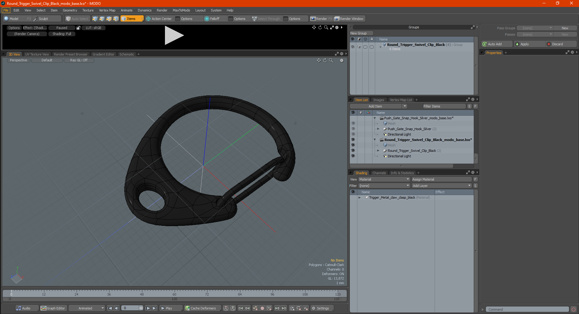 Round Trigger Swivel Clip Black is a high quality, photo real 3d model that will enhance detail and realism to any of your rendering projects. The model has a fully textured, detailed design that allows for close-up renders, and was originally modeled in 3ds Max 2020 and rendered with V-Ray. Renders have no postprocessing!