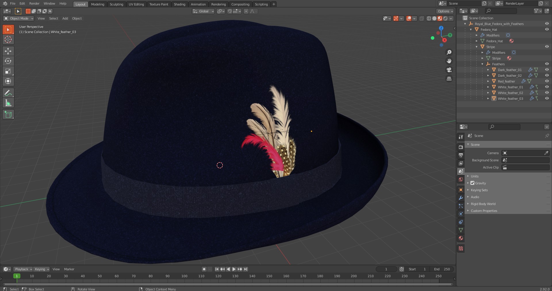 Royal Blue Fedora With Feathers is a high quality, photo real 3d model that will enhance detail and realism to any of your rendering projects. The model has a fully textured, detailed design that allows for close-up renders, and was originally modeled in 3ds Max 2020 and rendered with V-Ray. Renders have no postprocessing!