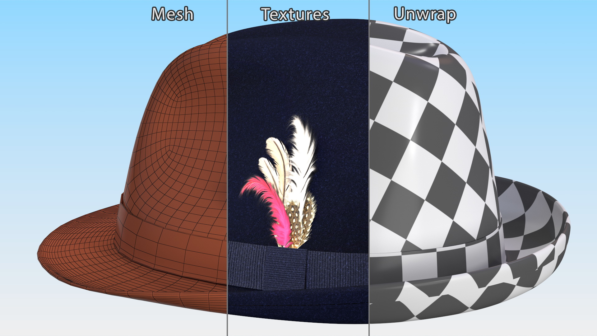 Royal Blue Fedora With Feathers is a three-dimensional model of Fedora which is a classic style of wool hat characterized by its soft, brimmed crown and a crease down the center.