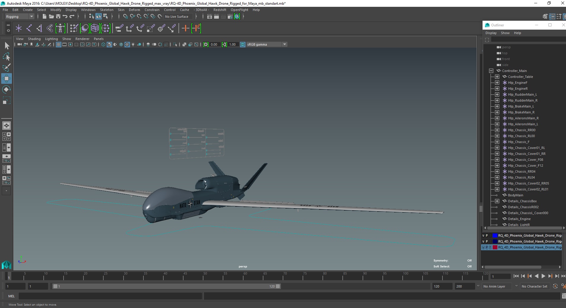 RQ-4D Phoenix Global Hawk Drone Rigged for Maya is fully rigged and is ready to be animated in Maya. You can easily position it the way you need or animate it the way your project requires. See the screenshots to get an idea of how rigging works. The pose of the model on the render images is an example and can be recreated using rig, it is not initially included into the product.