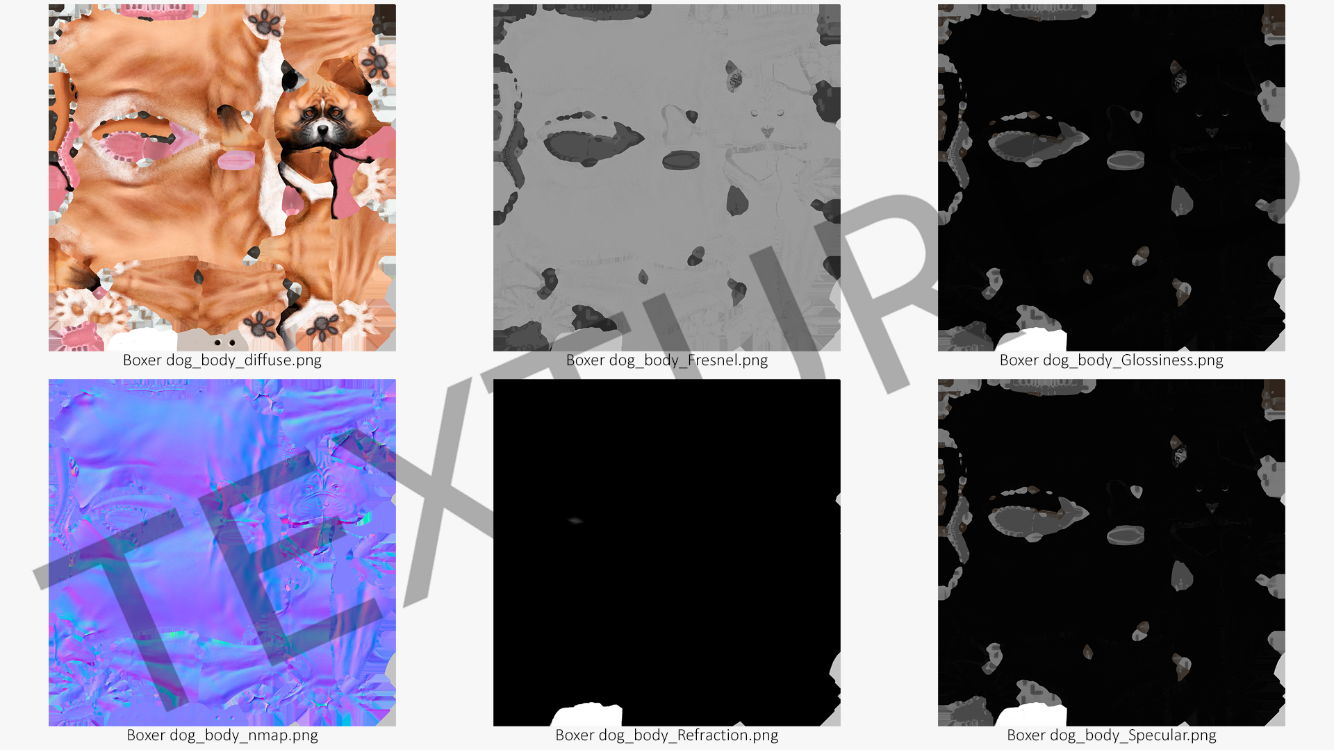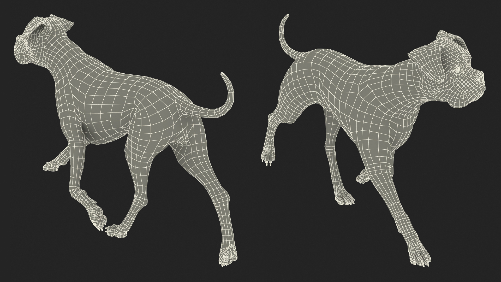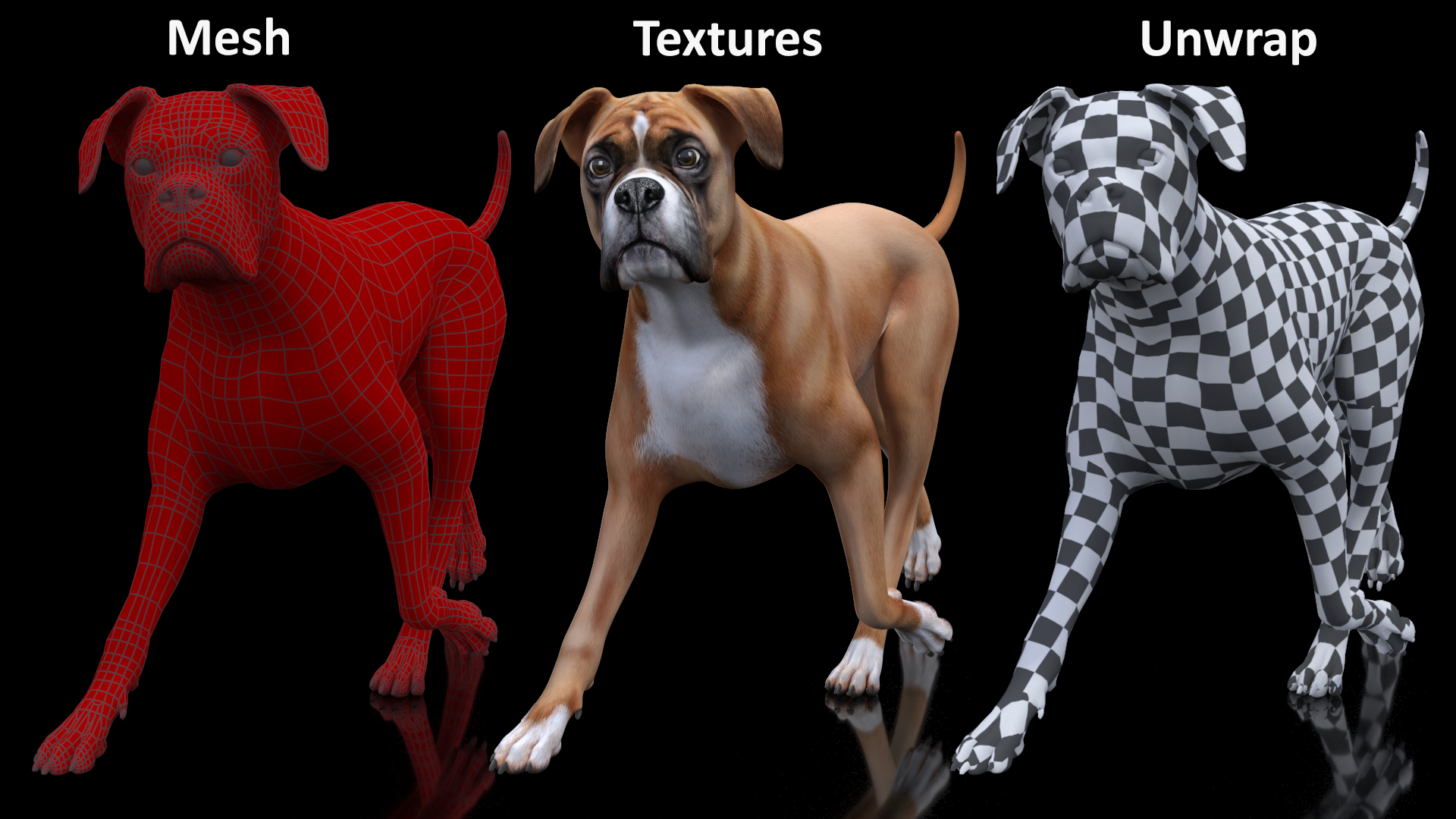 Running Dog Boxer is a three-dimensional model of boxer bred dog animal, that is a medium-sized breed of domestic dog known for its muscular build, short coat, and distinctive face. The Boxer is a medium-sized breed of domestic dog that originated in Germany. Recognizable by its muscular build, short coat, and distinctive facial features, including a broad muzzle and large, expressive eyes, the Boxer is energetic, playful, and intelligent. These dogs are loyal and protective, making them excellent family pets and watchdogs. They thrive on human companionship and require regular exercise and mental stimulation. Boxers are known for their affectionate nature and strong bond with their families. For dog breeding, canine home animal care, dog care equipment, dog health care, dog puppy care, pet dog veterinary, veterinary education, home pet companion animals, home pet accessories, dog veterinary service, dog type home companions promotional projects, well known dog breeds, and domestic dogs. Running Dog Boxer is a high quality, photo real 3d model that will enhance detail and realism to any of your rendering projects. The model has a fully textured, detailed design that allows for close-up renders, and was originally modeled in 3ds Max 2020 and rendered with V-Ray. Renders have no postprocessing! Hope you like it! ***** Features: - High quality polygonal model, has real dimensions. Easy to merge into your scene. - Units: cm - The model was created with the optimal number of polygons. (The Meshsmooth modifier is assigned to the original mesh. Easy to increase mesh resolution if necessary.) - All the objects come with complete UVs All textures and materials are included and mapped. (All colors can be easily modified.) - All objects are logically named and grouped for ease of objects selection and scene management. - No part-name confusion when importing several models into a scene. - No cleaning up necessary (Model does not include any backgrounds or scenes used in preview images.) - just drop model into your scene. - No special plugin needed to open scene. - PBR Materials ***** File Formats: - 3ds Max - Cinema 4D - Maya - Blender - OBJ, 3DS, FBX ***** Textures Formats: - 6 png (4096x4096) ***** 3d Molier International is a team of 3D artists with over a 15 years of experience. The company participated in various projects allowing us to learn our clients needs. Every model we build goes through thorough Quality assessment both visual and technical to make sure the assets look realistic and the models are of the best quality, which you can tell by looking at the renders - none of the has any postprocessing. We produce 3D models. This is our main activity. Our goal is to create a 3D copy of all objects on the world. Buy 3D models from professionals! Also check out our other models, just click on our user name to see complete gallery. (c) 3d_molier International - 2025
