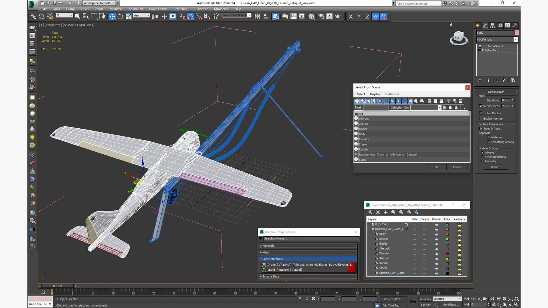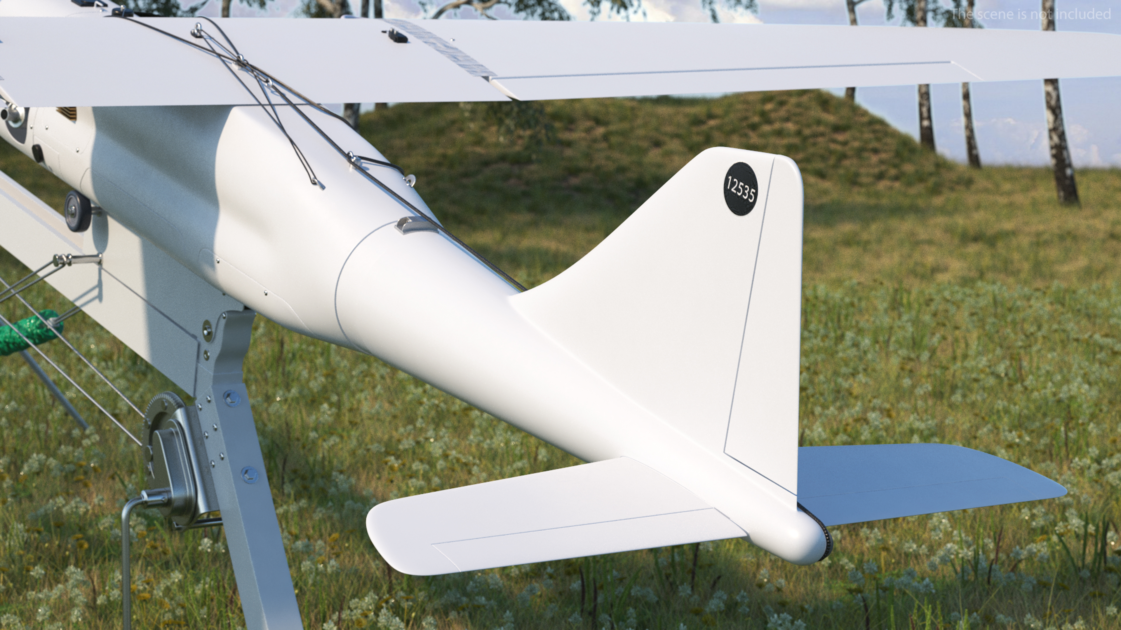 Russian UAV Orlan 10 with Launch Catapult is a 3d model of reconnaissance, unmanned aerial vehicle (UAV) and tool designed to launch it.