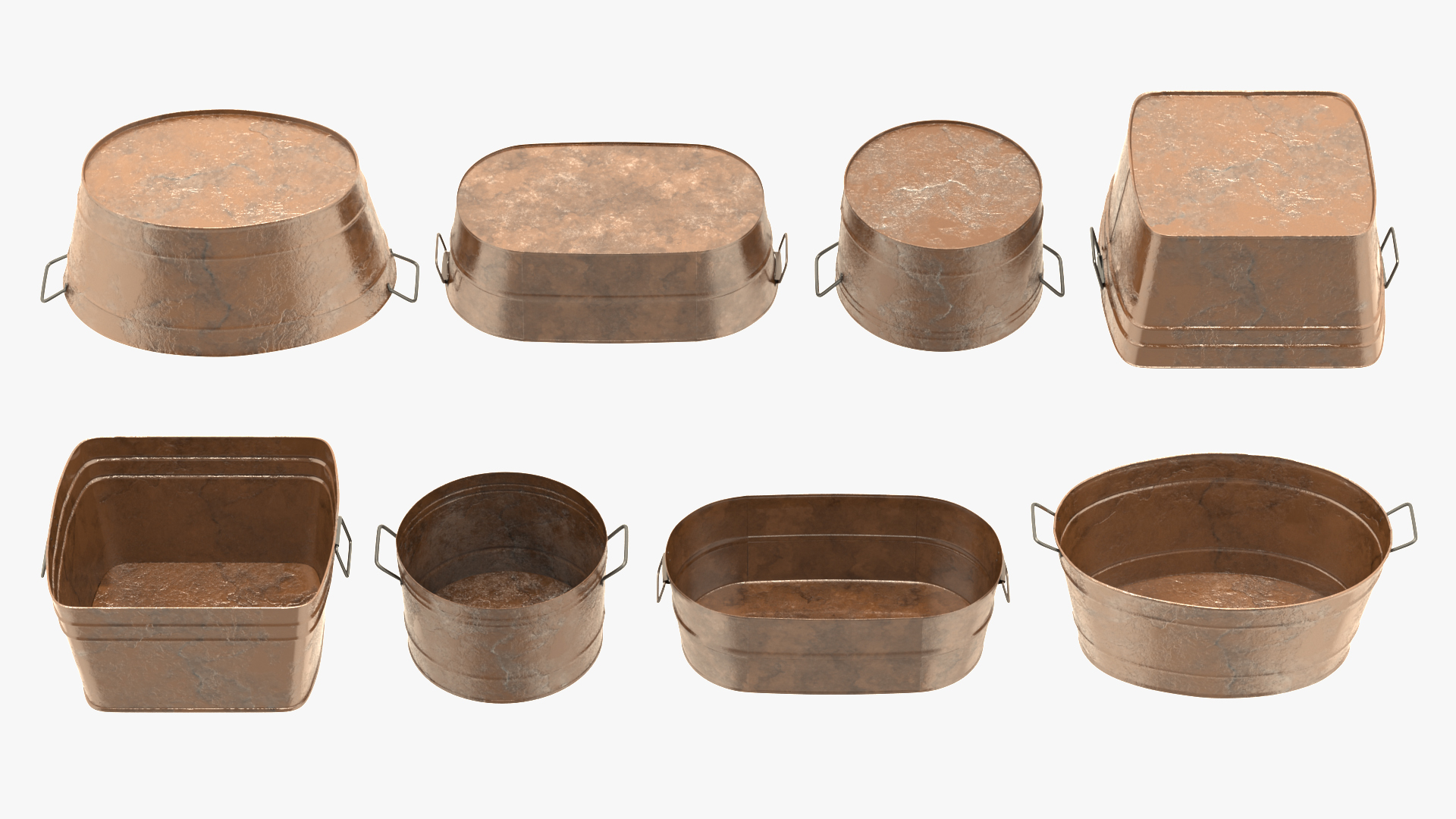 Rusty Metal Container Set with Large Rusty Steel Oval Tub; Rusty Metal Container Set; Steel Round Tub Rusty; Rusty Square Tub; and Rusty Oval Tub.