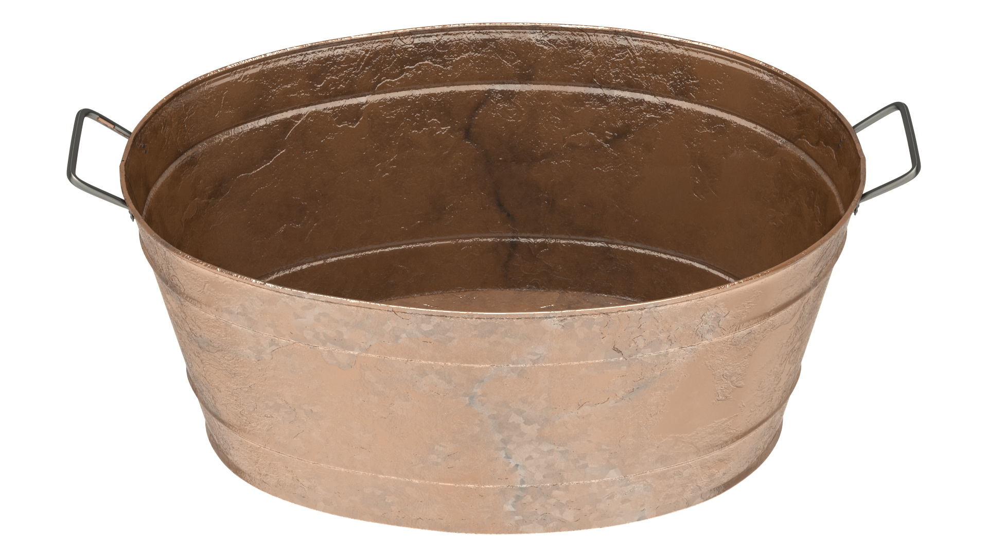 The old used rural tin metal tank for holding water in which a human person may wash, or bathe.