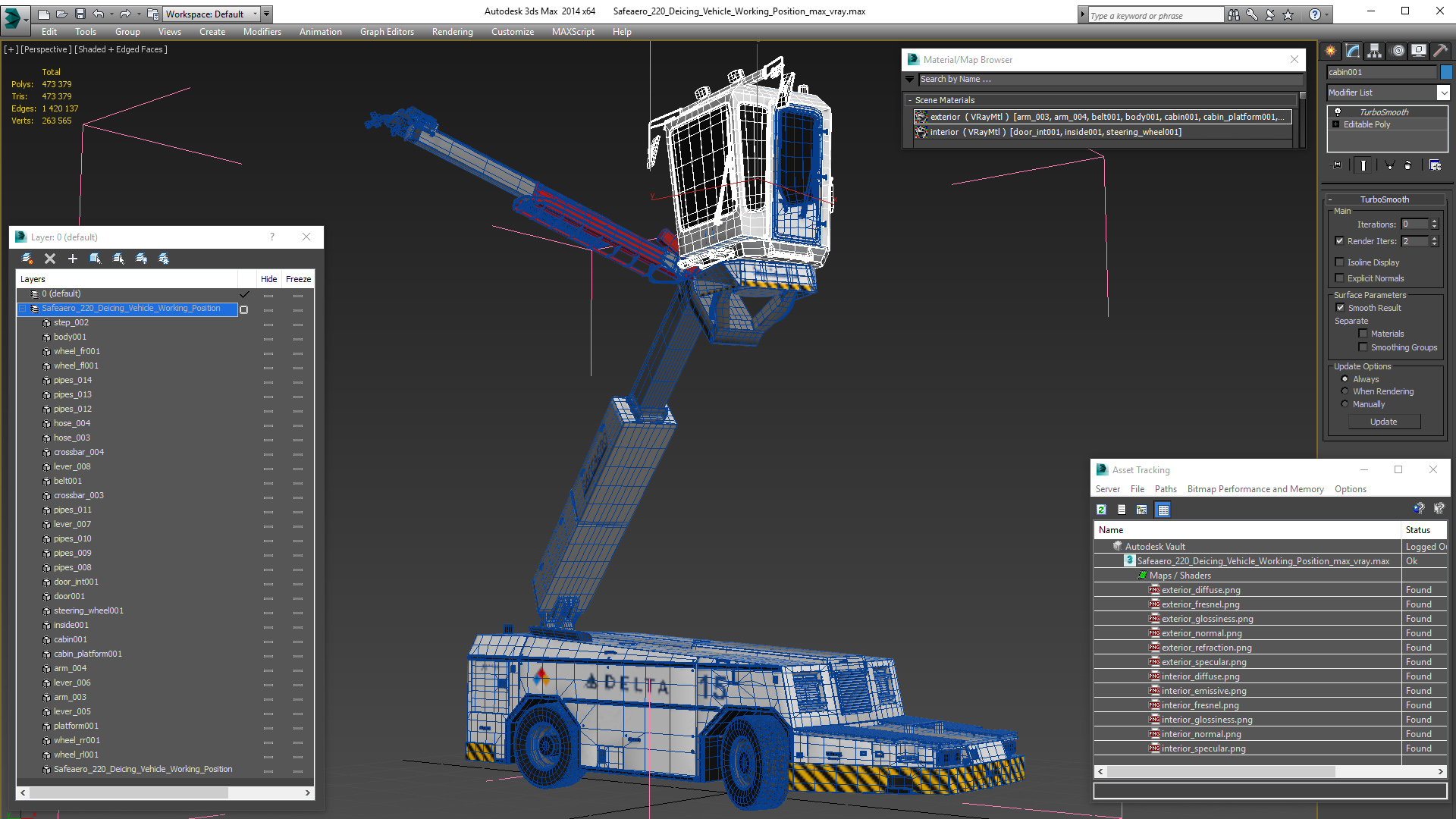 Safeaero 220 Deicing Vehicle Working Position is a high quality, photo real 3d model that will enhance detail and realism to any of your rendering projects. The model has a fully textured, detailed design that allows for close-up renders, and was originally modeled in 3ds Max 2020 and rendered with V-Ray. Renders have no postprocessing!