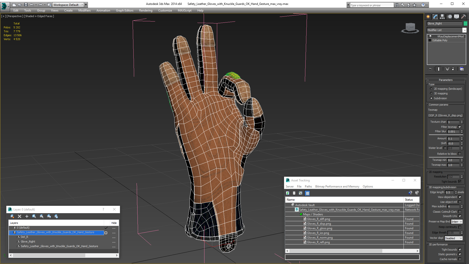 Safety Leather Gloves with Knuckle Guards OK Hand Gesture is a high quality, photo real 3d model that will enhance detail and realism to any of your rendering projects. The model has a fully textured, detailed design that allows for close-up renders, and was originally modeled in 3ds Max 2020 and rendered with V-Ray. Renders have no postprocessing!