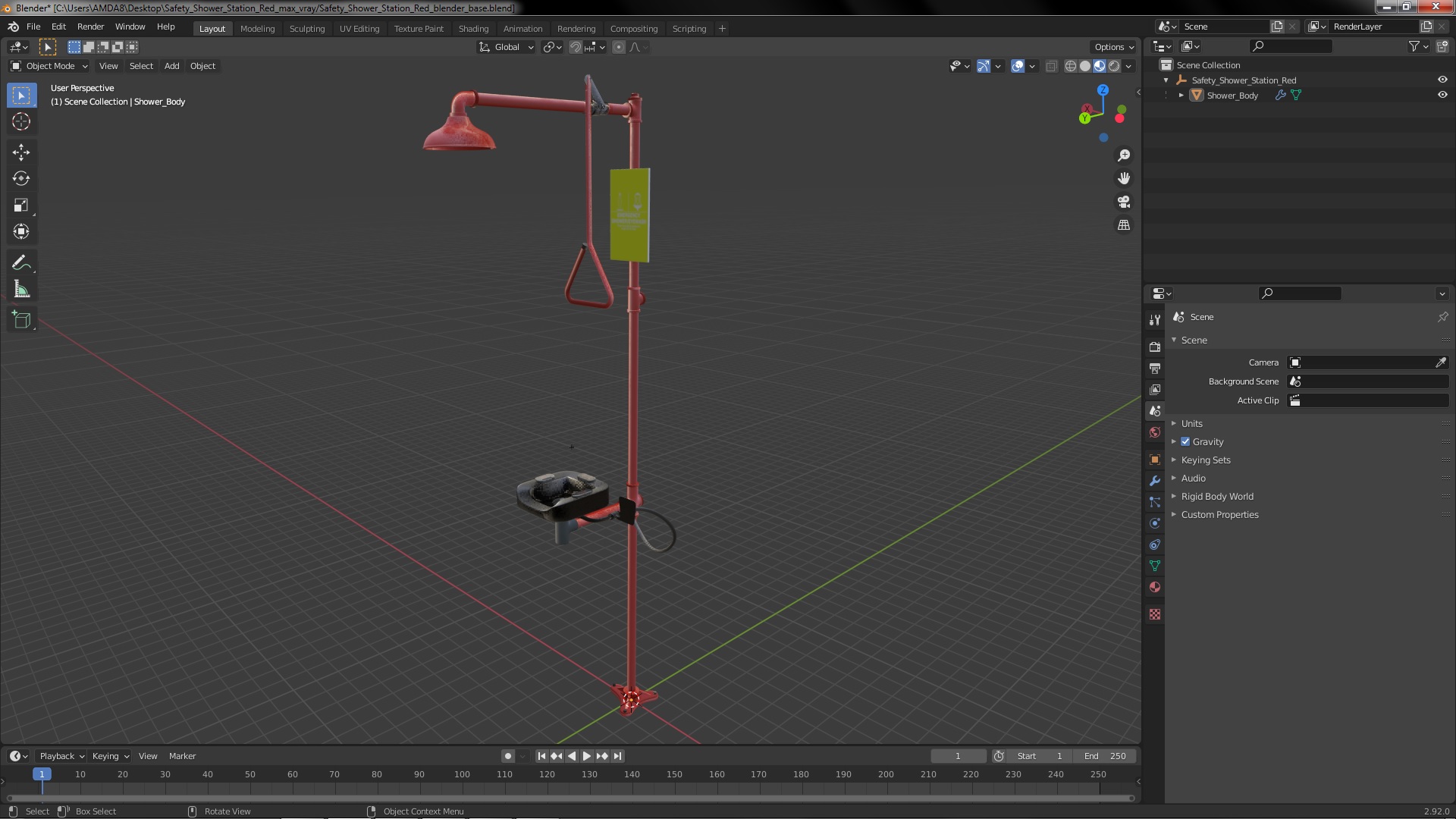 Safety Shower Station Red is a high quality, photo real 3d model that will enhance detail and realism to any of your rendering projects. The model has a fully textured, detailed design that allows for close-up renders, and was originally modeled in 3ds Max 2020 and rendered with V-Ray. Renders have no postprocessing!