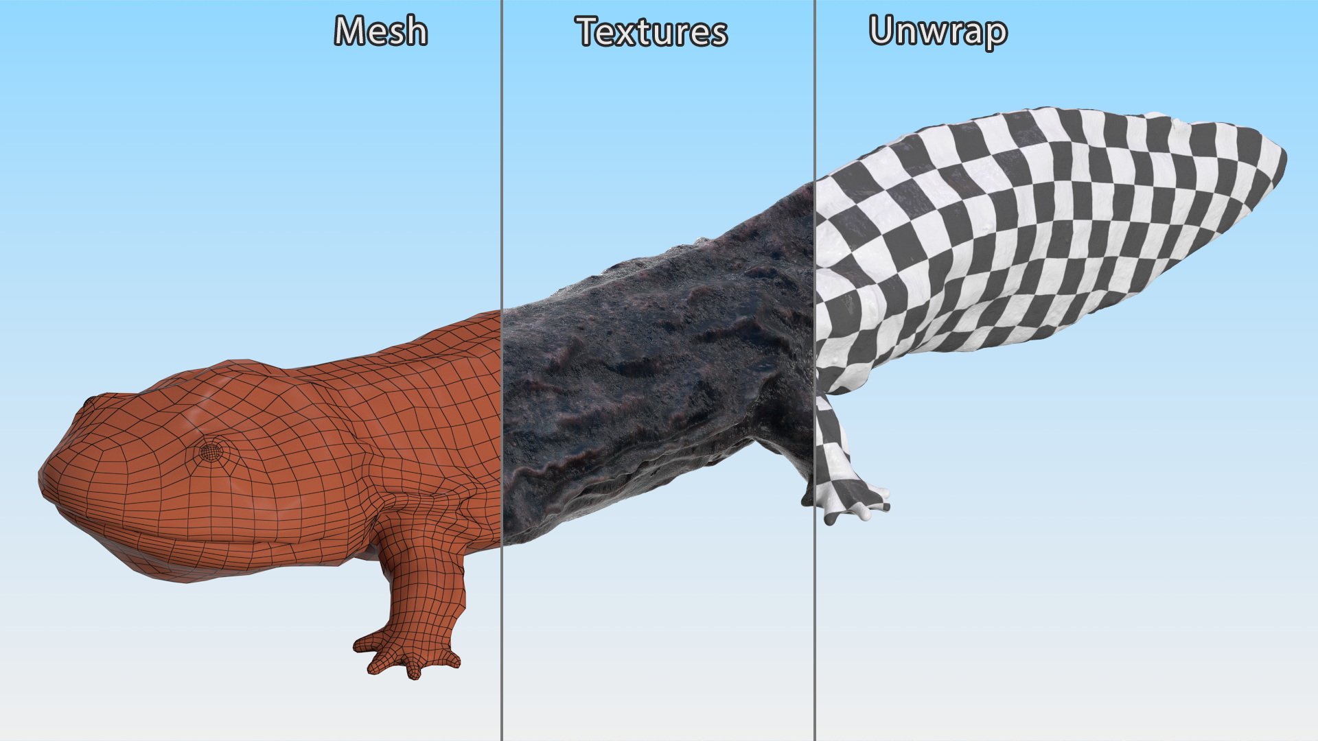 Salamander Dark Wet is a three-dimensional model of giant salamander which is a specimen of Cryptobranchidae which are a family of fully aquatic salamanders, and which are known as the giant salamanders. The giant salamander, a type of Cryptobranchidae, stands out as a fully aquatic amphibian renowned for its large size. Often called giant salamanders, these creatures exemplify the remarkable diversity within the amphibian class. For amphibian animals, Japanese fauna, aquatic animals, wild amphibian animals, zoological science, zoology science, American fauna, Asian wild animals, Chinese wild creatures, biology science, wild animals, Asian fauna, Australian fauna, Chinese fauna, and aquatic animals promotional projects. Salamander Dark Wet is a high quality, photo real 3d model that will enhance detail and realism to any of your rendering projects. The model has a fully textured, detailed design that allows for close-up renders, and was originally modeled in 3ds Max 2020 and rendered with V-Ray. Renders have no postprocessing! Hope you like it! ***** Features: - High quality polygonal model, has real dimensions. Easy to merge into your scene. - Units: cm - The model was created with the optimal number of polygons. (The Meshsmooth modifier is assigned to the original mesh. Easy to increase mesh resolution if necessary.) - All the objects come with complete UVs All textures and materials are included and mapped. (All colors can be easily modified.) - All objects are logically named and grouped for ease of objects selection and scene management. - No part-name confusion when importing several models into a scene. - No cleaning up necessary (Model does not include any backgrounds or scenes used in preview images.) - just drop model into your scene. - No special plugin needed to open scene. - PBR Materials ***** File Formats: - 3ds Max - Cinema 4D - Maya - Blender - OBJ, 3DS, FBX ***** Textures Formats: - 7 png (4096x4096) ***** 3d Molier International is a team of 3D artists with over a 15 years of experience. The company participated in various projects allowing us to learn our clients needs. Every model we build goes through thorough Quality assessment both visual and technical to make sure the assets look realistic and the models are of the best quality, which you can tell by looking at the renders - none of the has any postprocessing. We produce 3D models. This is our main activity. Our goal is to create a 3D copy of all objects on the world. Buy 3D models from professionals! Also check out our other models, just click on our user name to see complete gallery. (c) 3d_molier International - 2025