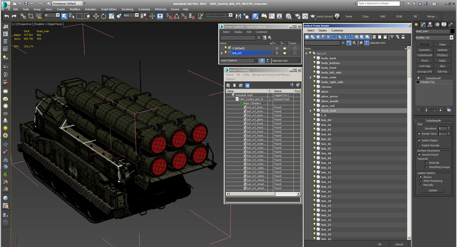 SAM System Buk M3 9K317M is a high quality, photo real 3d model that will enhance detail and realism to any of your rendering projects. The model has a fully textured, detailed design that allows for close-up renders, and was originally modeled in 3ds Max 2020 and rendered with V-Ray. Renders have no postprocessing!