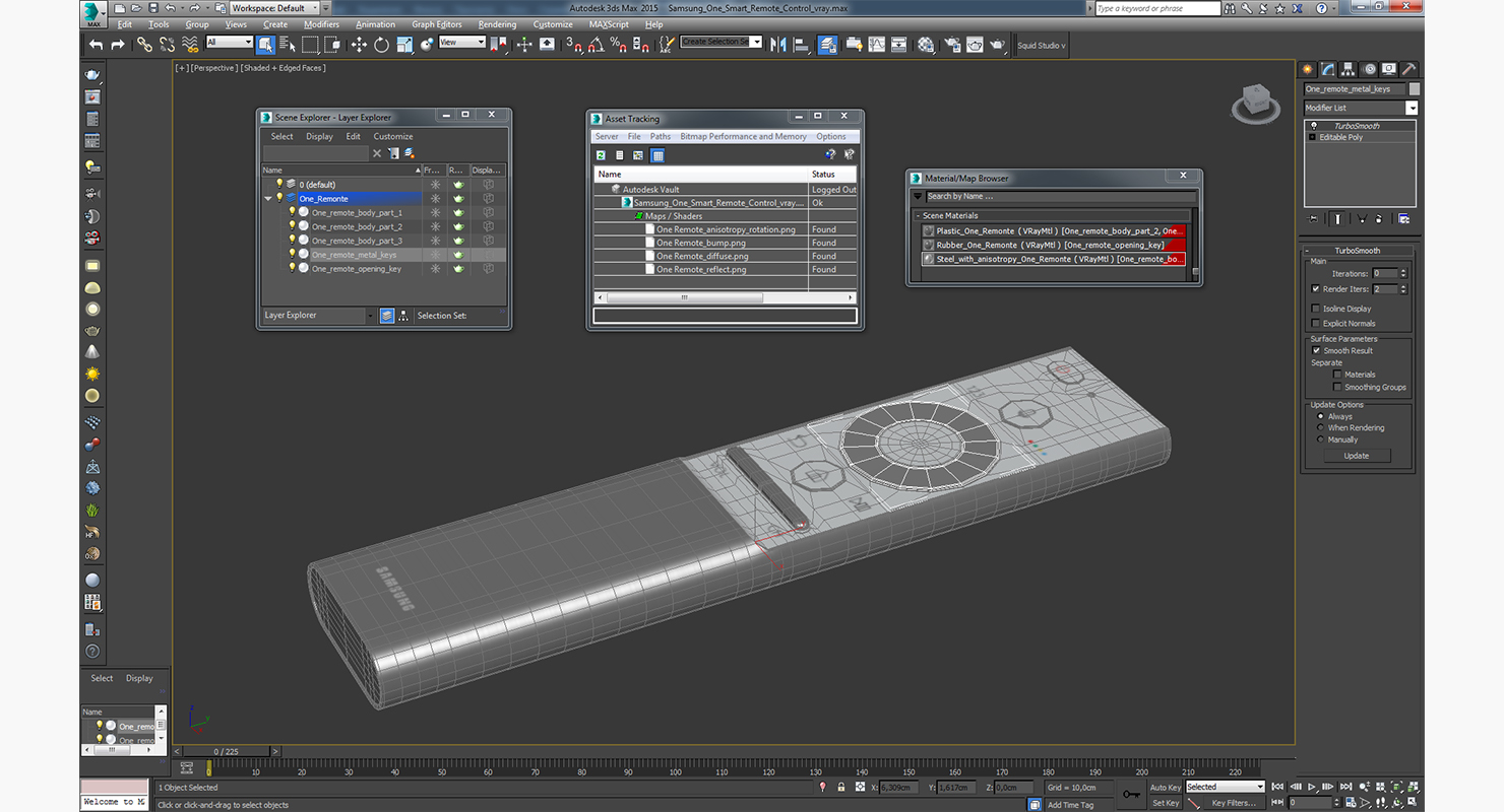 Samsung One Smart Remote Control is a high quality, photo real 3d model that will enhance detail and realism to any of your rendering projects. The model has a fully textured, detailed design that allows for close-up renders, and was originally modeled in 3ds Max 2020 and rendered with V-Ray. Renders have no postprocessing!
