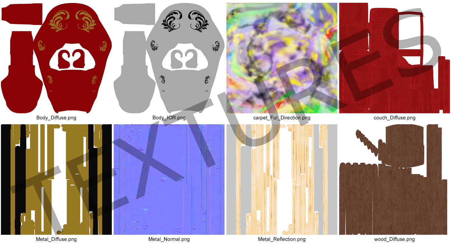 All textures and materials are included and mapped. (All colors can be easily modified.)