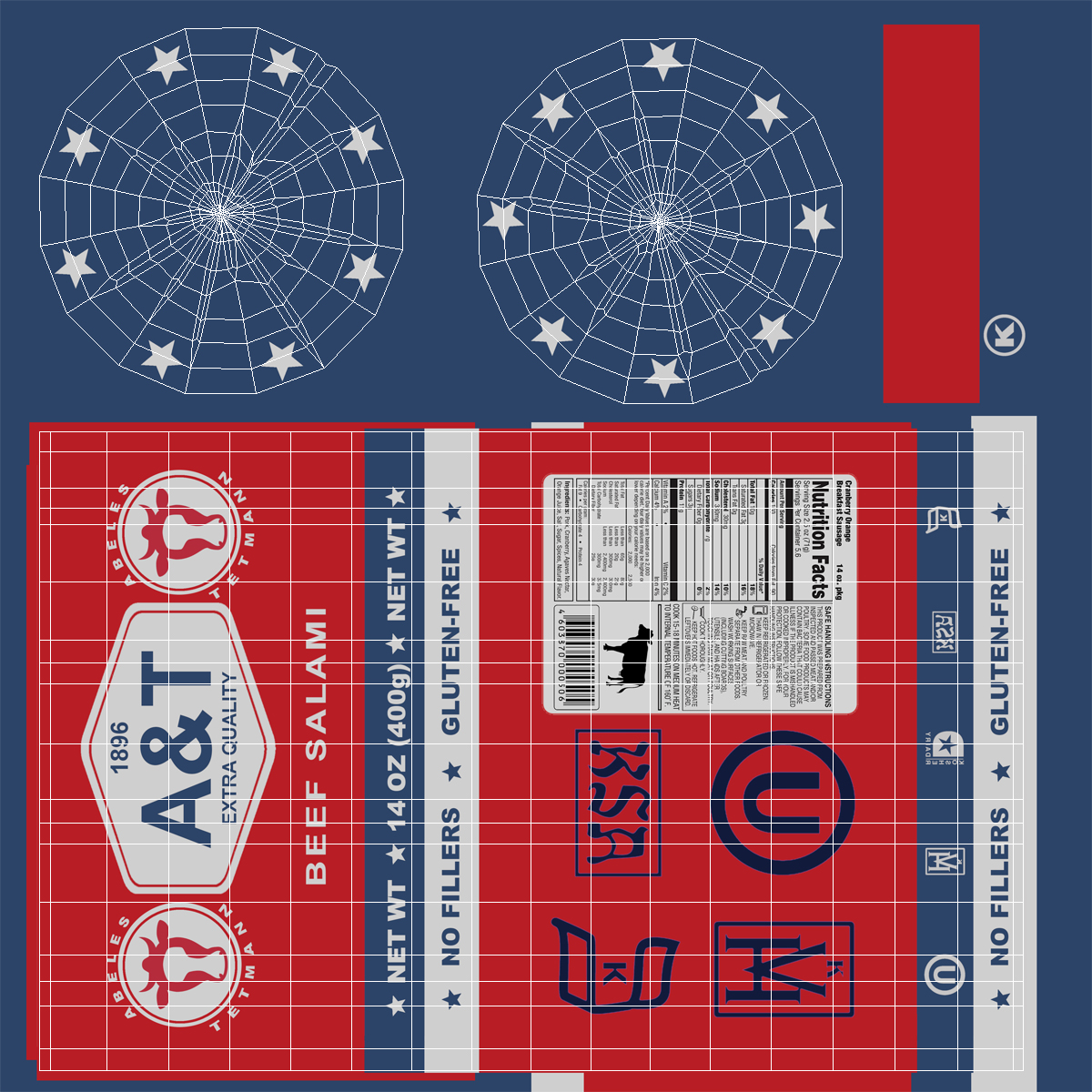 A&T Sausage Bandaged with String, in blue, white and red package.