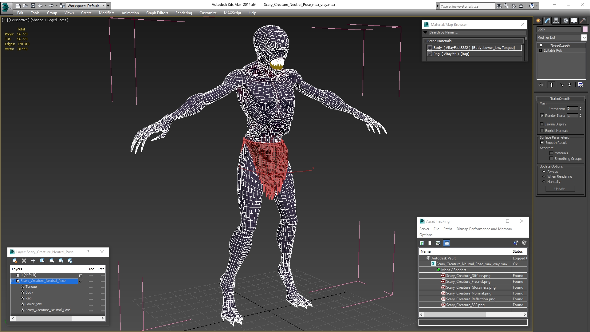 Scary Creature Neutral Pose is a high quality, photo real 3d model that will enhance detail and realism to any of your rendering projects. The model has a fully textured, detailed design that allows for close-up renders, and was originally modeled in 3ds Max 2020 and rendered with V-Ray. Renders have no postprocessing!