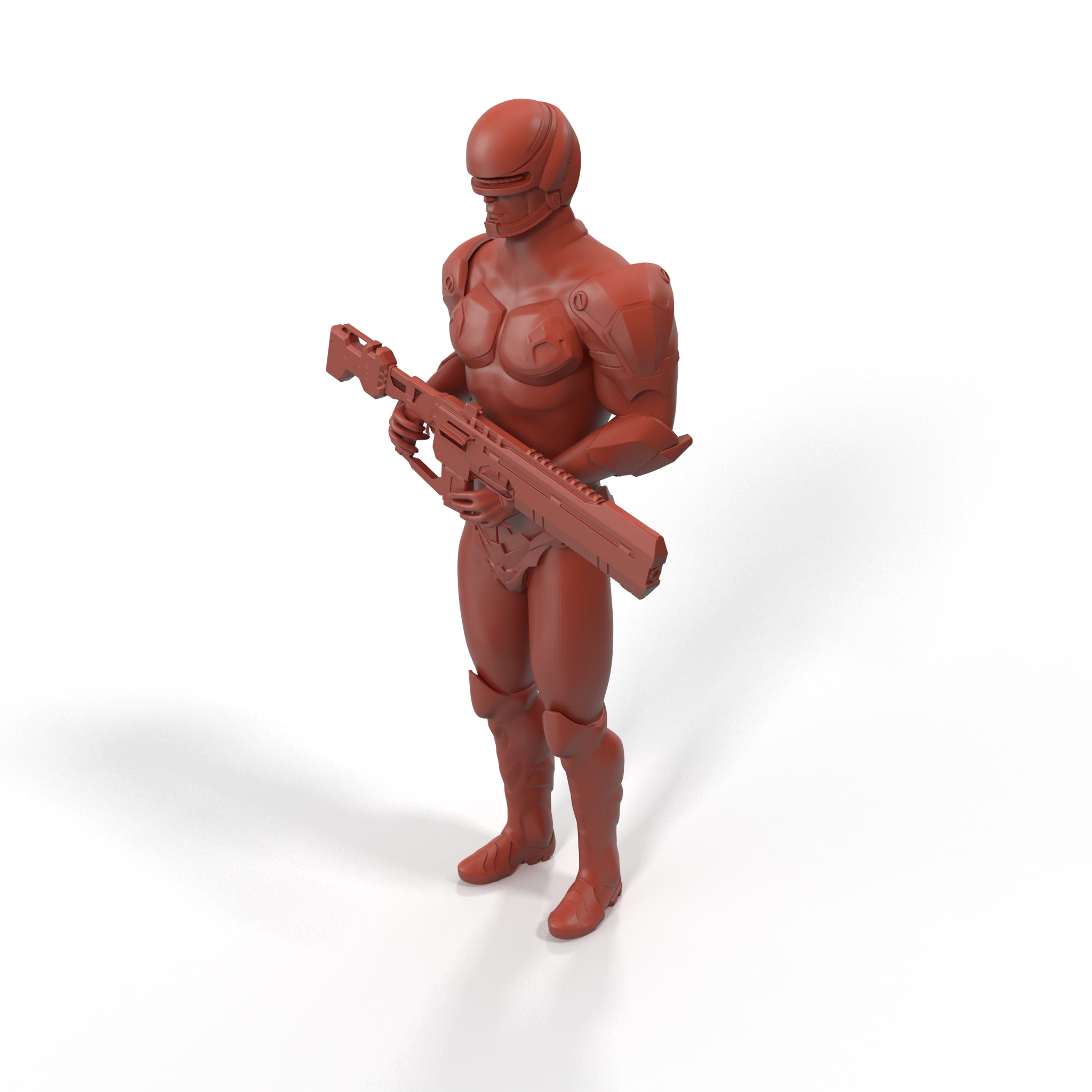 Sci Fi Soldier with Assault Rifle for 3D Print is a high-quality 3D model, ready to be used for 3D printing projects. The model's geometry is solid, allowing the forms and details to be replicated excellently in a 3D print. The product renders were created in 3Ds Max with V-Ray to demonstrate how the model may look with materials applied. The renders have no post-processing!