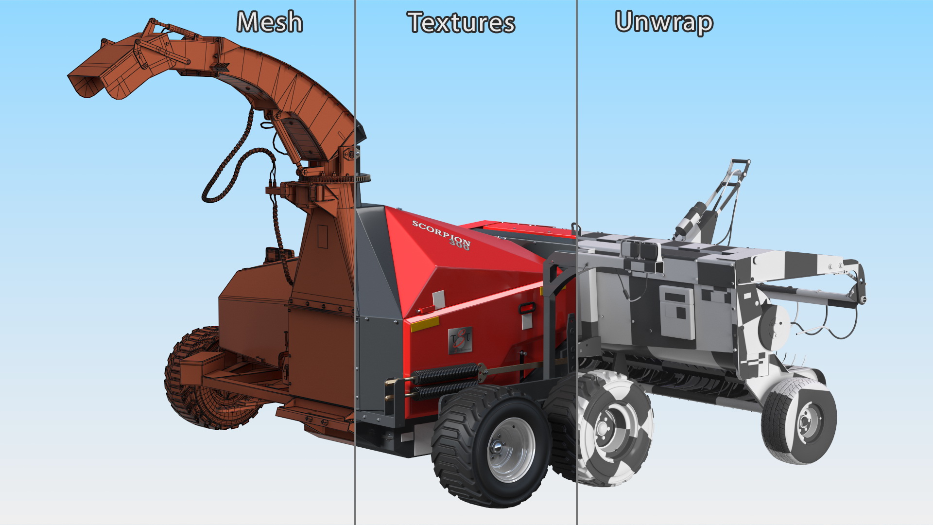 Scorpion 300 Forage Harvester is a high quality, photo real 3d model that will enhance detail and realism to any of your rendering projects. The model has a fully textured, detailed design that allows for close-up renders, and was originally modeled in 3ds Max 2020 and rendered with V-Ray. Renders have no postprocessing!