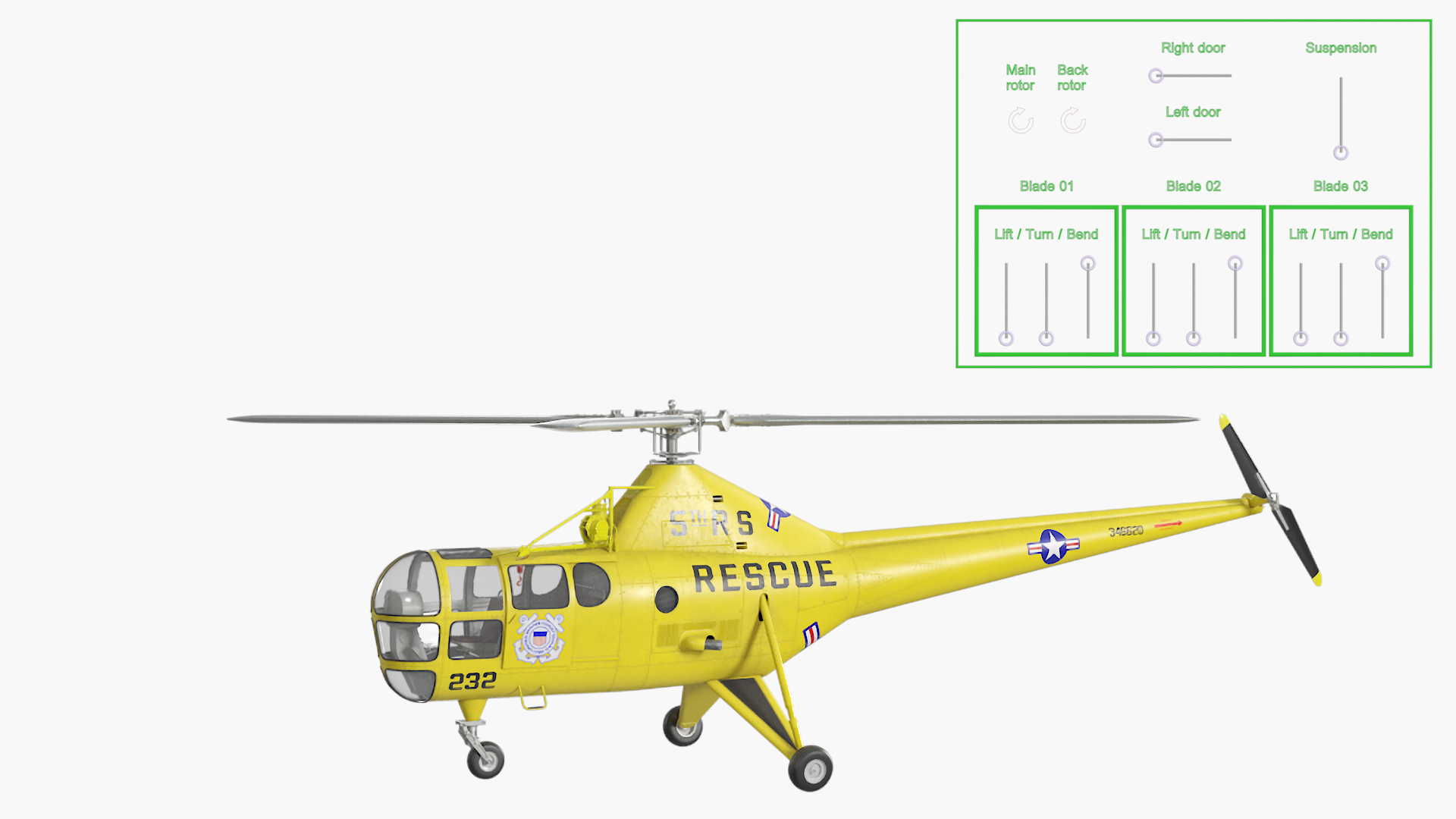 Search and Rescue Helicopter Sikorsky H-5 Rigged is fully rigged and is ready to be animated. You can easily position it the way you need or animate it the way your project requires using helpers in 3D Studio Max. See the turntable to get an idea of how rigging works.