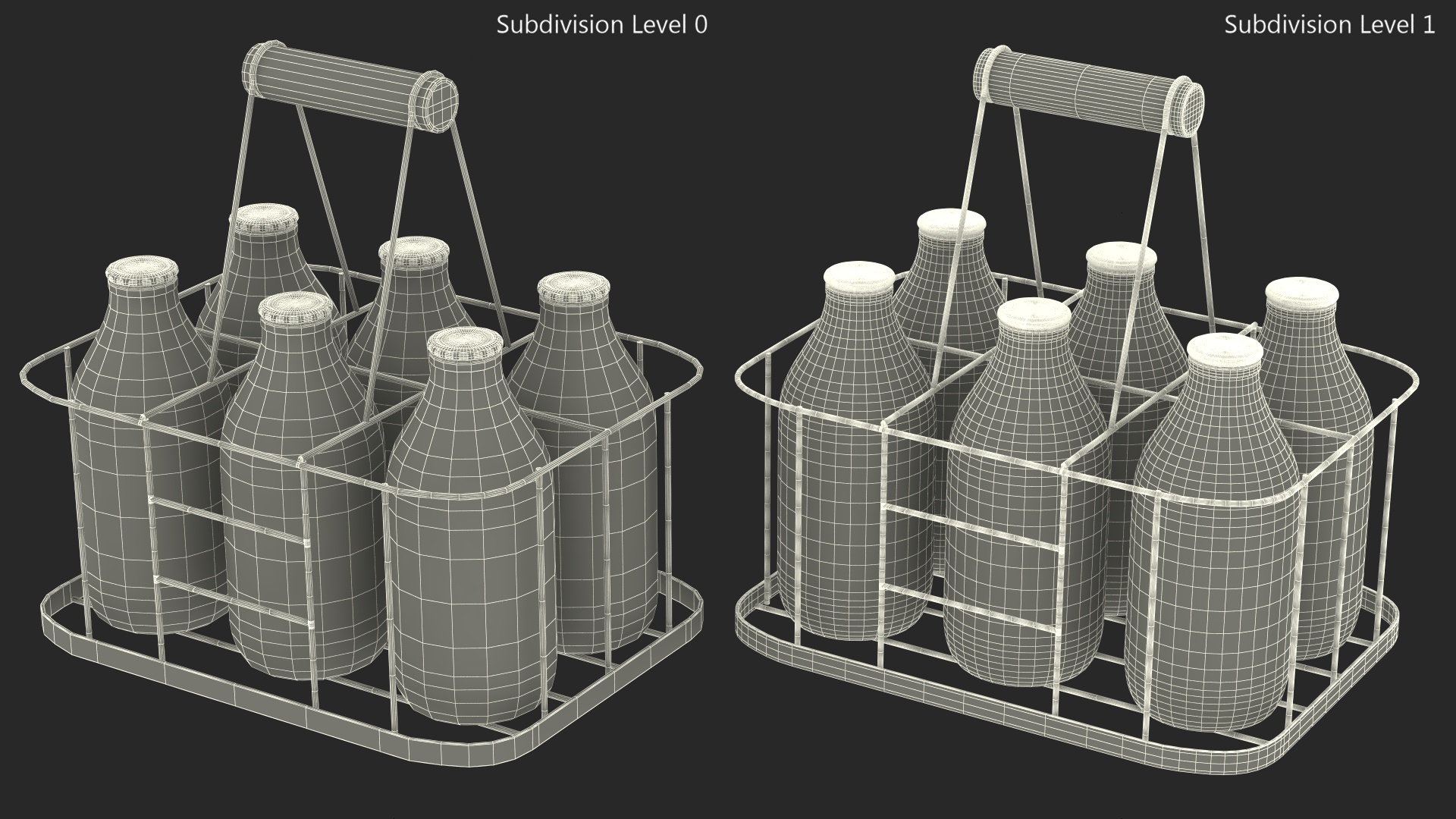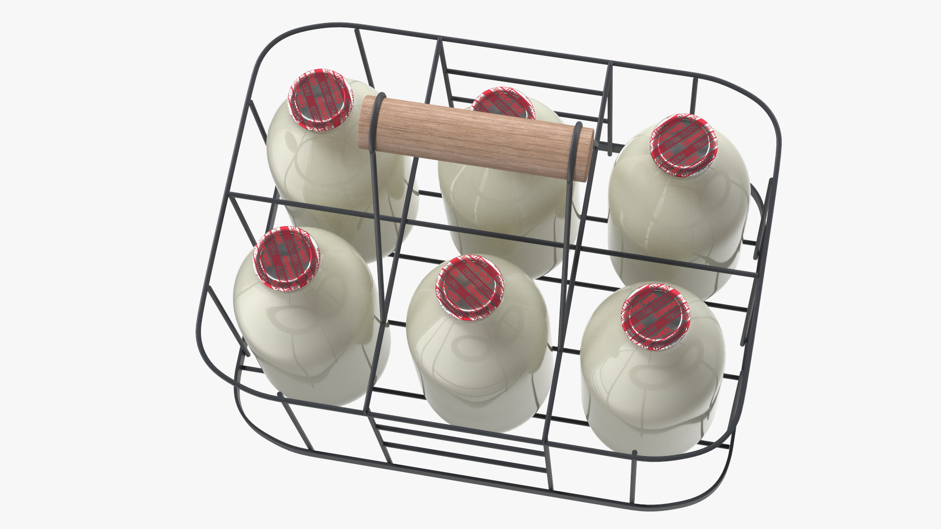 Semi-Skimmed Milk Bottles with Foil Top in Carrying Case is a three-dimensional model of metal wire pack milk bottles holder or carrier, which is a well known traditional way of packaging and transporting milk bottles.