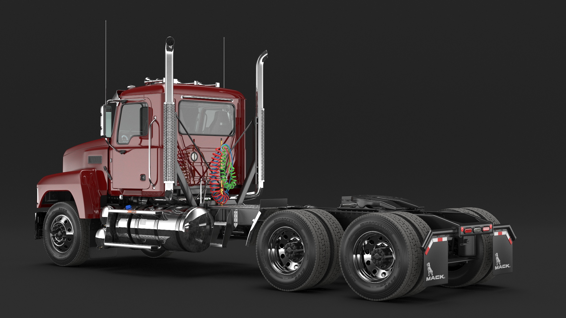 This model features a powerful, aerodynamic cab with signature Mack styling, including a detailed front grille, headlights, and side mirrors. The truck is equipped with dual rear axles, large tires, and a robust chassis for carrying heavy loads. The detailed undercarriage and exhaust system, along with a spacious driver's cabin, make this model ideal for showcasing trucking and logistics operations.