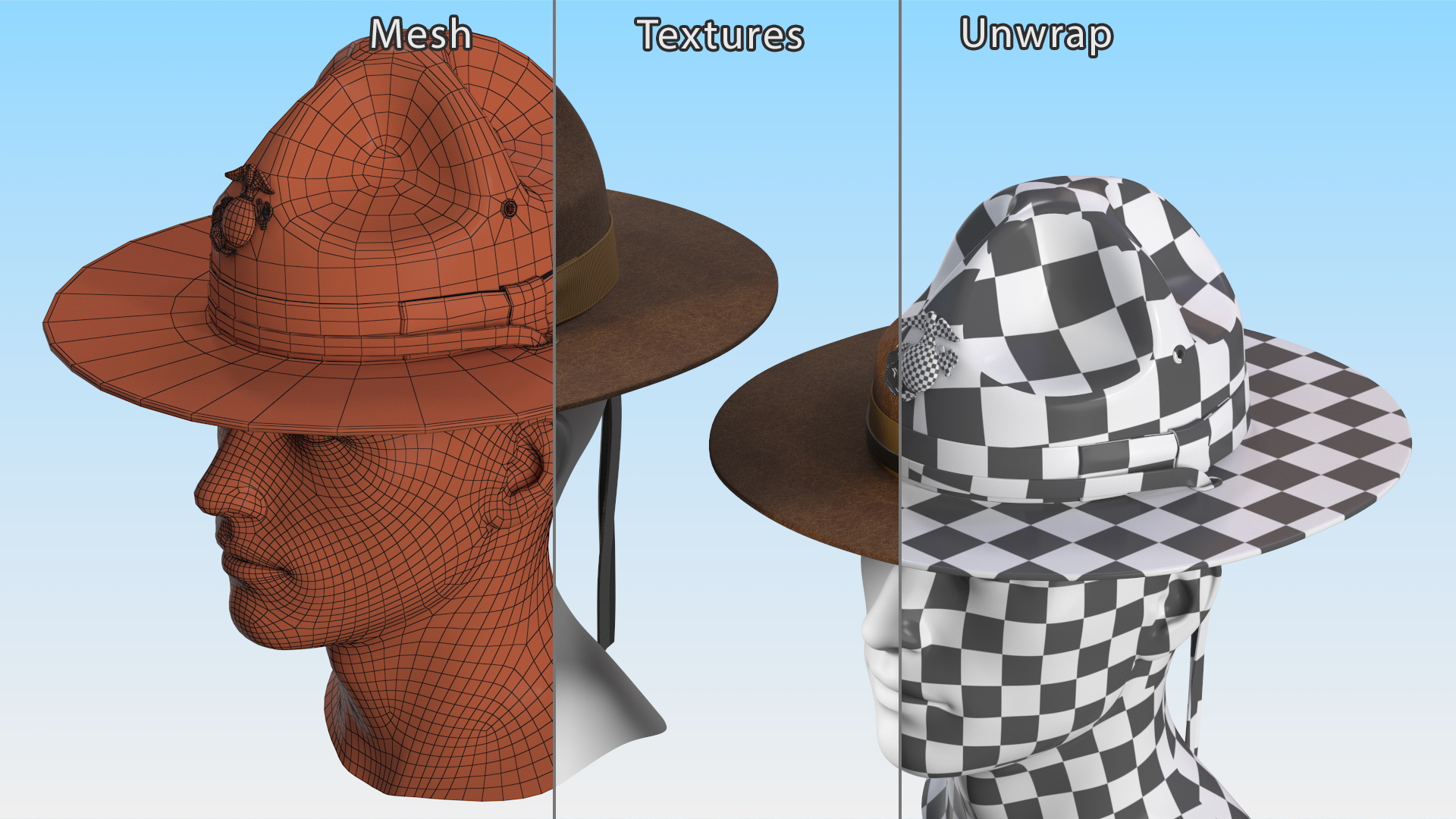Sergeant Campaign Hat with Cockade Brown on Mannequin is a high quality, photo real 3d model that will enhance detail and realism to any of your rendering projects. The model has a fully textured, detailed design that allows for close-up renders, and was originally modeled in 3ds Max 2020 and rendered with V-Ray. Renders have no postprocessing!