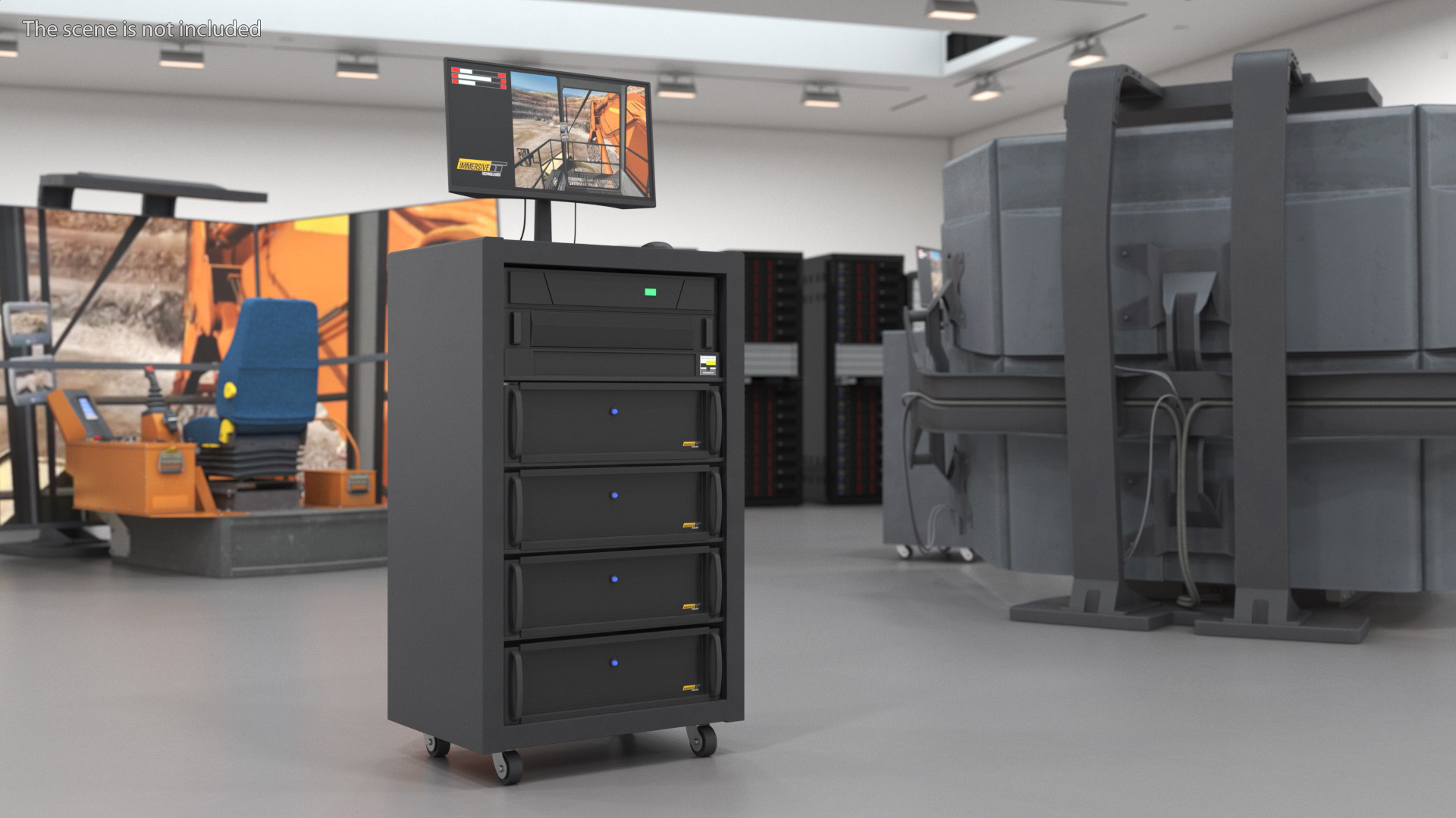 This model includes a tall server rack filled with organized server units, cooling systems, and wiring, accurately representing the hardware used in data centers or network operations. The model also features a connected desktop computer with a monitor mounted on the rack, used for overseeing system performance and diagnostics. The detailed design showcases cables, power supplies, and other essential components for a realistic tech environment.