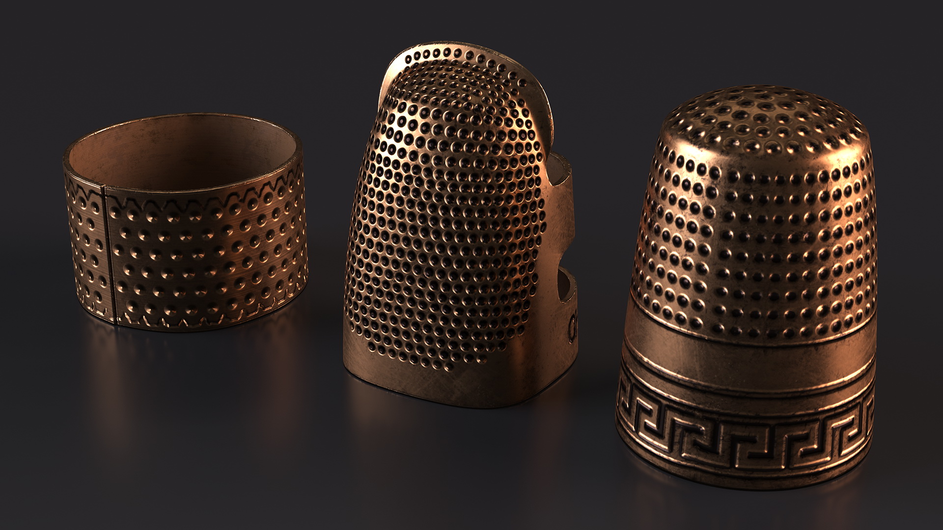 Sewing Thimbles Bronze Set is a 3D model of row of sewing tools which are small, protective caps worn on the fingertip to protect finger from the sharp end of a needle while sewing.