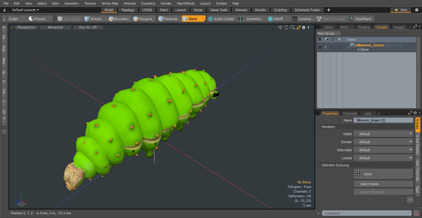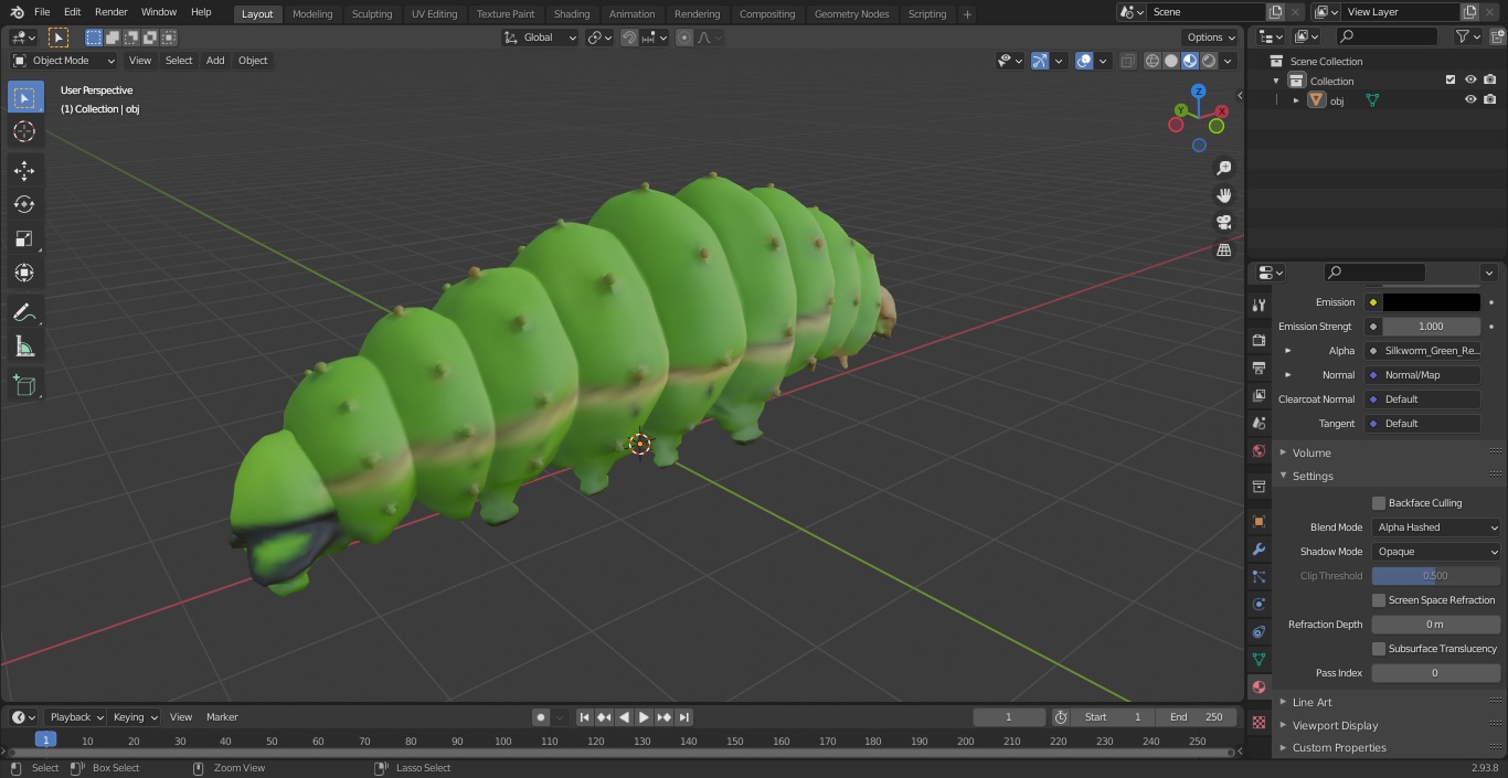 Silkworm Green is a three-dimensional model of a small silkworm insect, which is the larva of a well known silk moth.