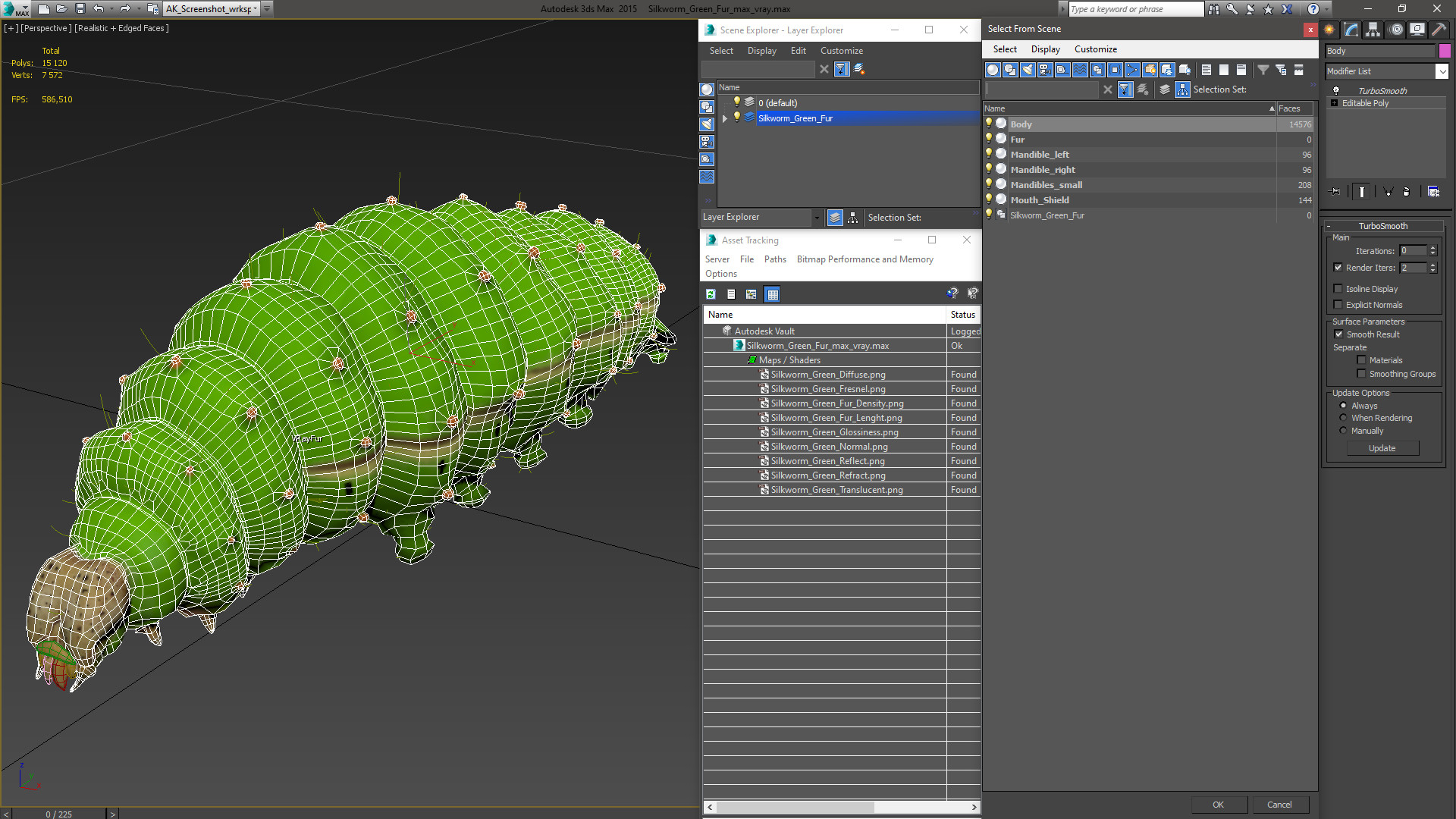 Silkworm Green Fur is a high quality, photo real 3d model that will enhance detail and realism to any of your rendering projects. The model has a fully textured, detailed design that allows for close-up renders, and was originally modeled in 3ds Max 2020 and rendered with V-Ray. Renders have no postprocessing!