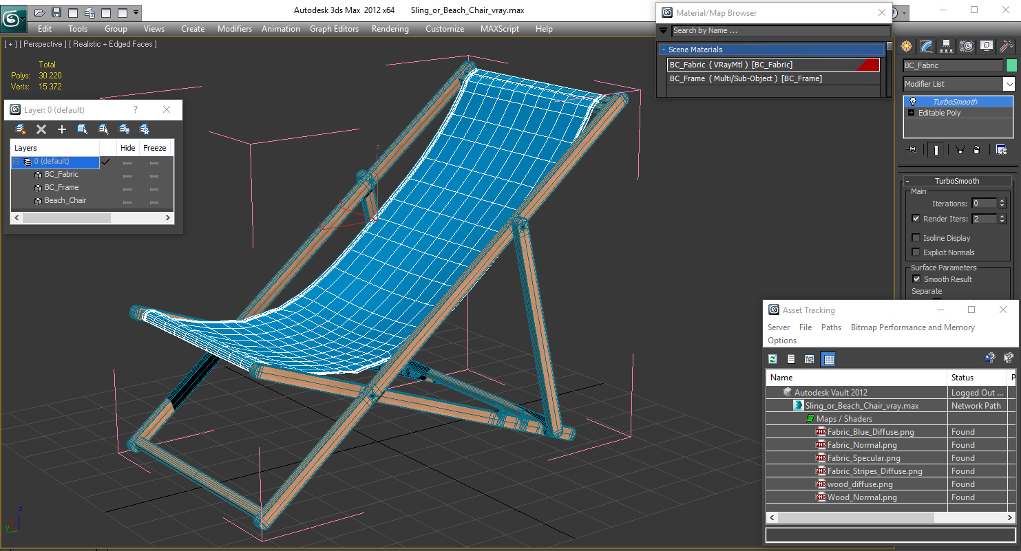 Sling or Beach Chair is a high quality, photo real 3d model that will enhance detail and realism to any of your rendering projects. The model has a fully textured, detailed design that allows for close-up renders, and was originally modeled in 3ds Max 2020 and rendered with V-Ray. Renders have no postprocessing!