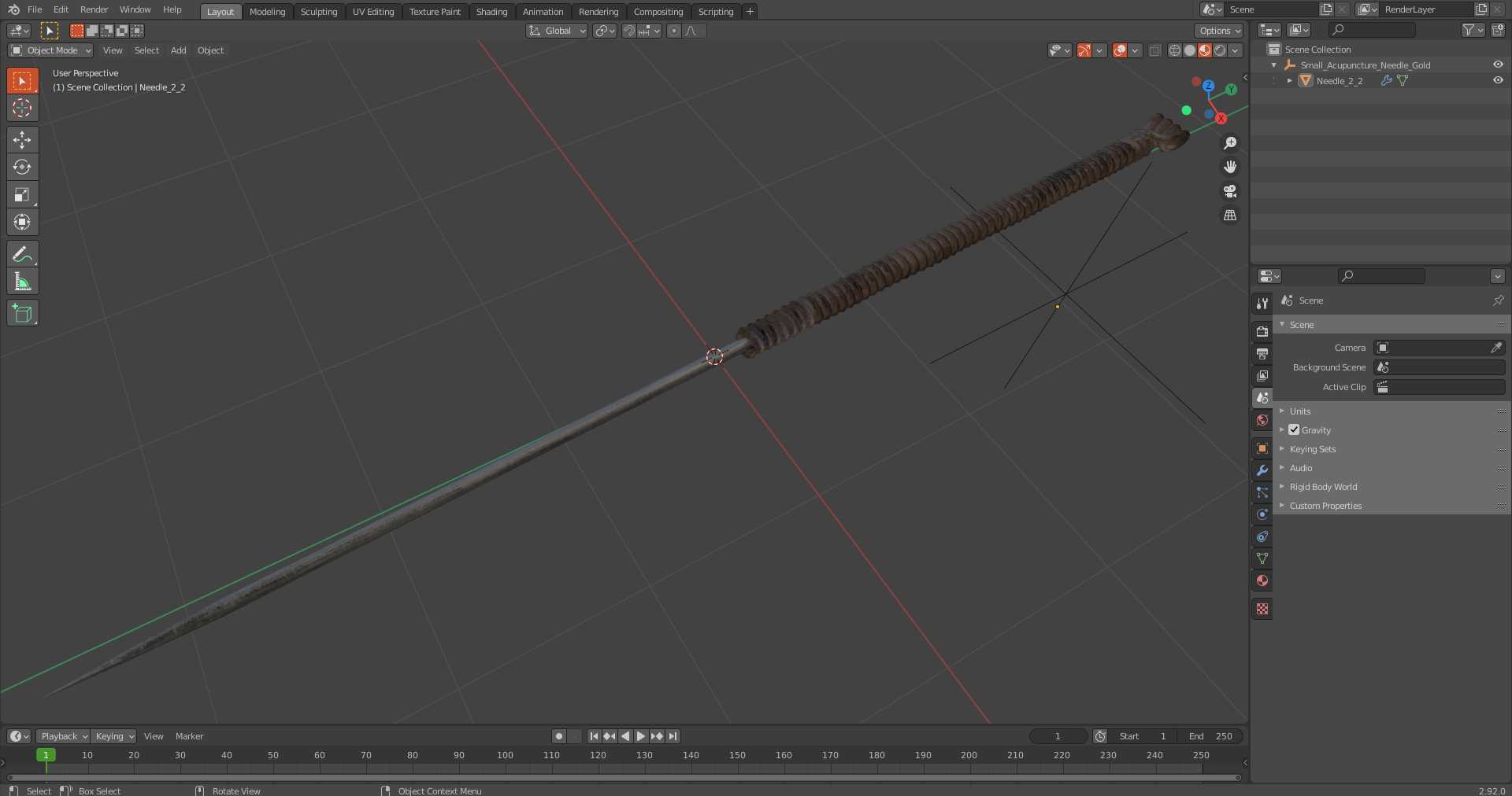 Small Acupuncture Needle Gold is a high quality, photo real 3d model that will enhance detail and realism to any of your rendering projects. The model has a fully textured, detailed design that allows for close-up renders, and was originally modeled in 3ds Max 2020 and rendered with V-Ray. Renders have no postprocessing!