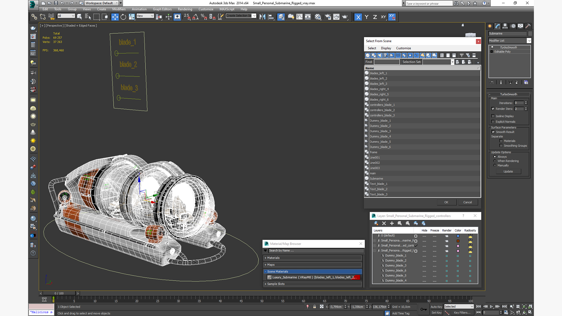 Small Personal Submarine Rigged is fully rigged and is ready to be animated. You can easily position it the way you need or animate it the way your project requires using helpers in 3D Studio Max. See the turntable to get an idea of how rigging works.