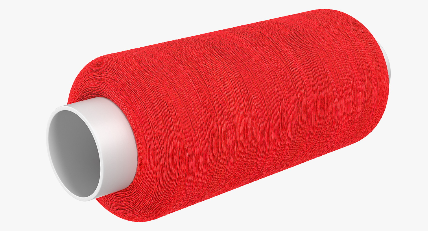 Red material for sewing art in the form of a cylindrical coiled winding bobbin or spool, and metal sewing needle.