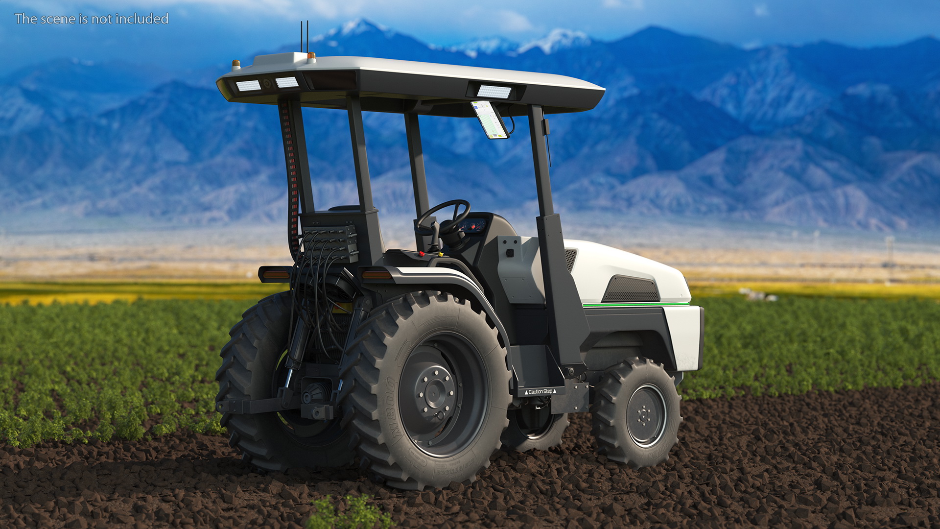 Smart Electric Tractor Dusty Rigged is a three-dimensional model of a robotic, modern, all electric, agricultural, farm, wheeled vehicle.