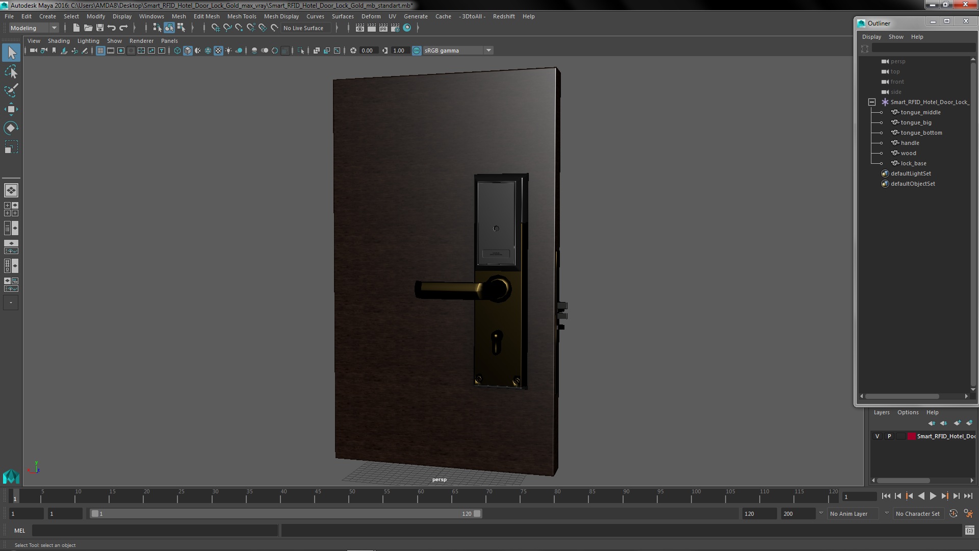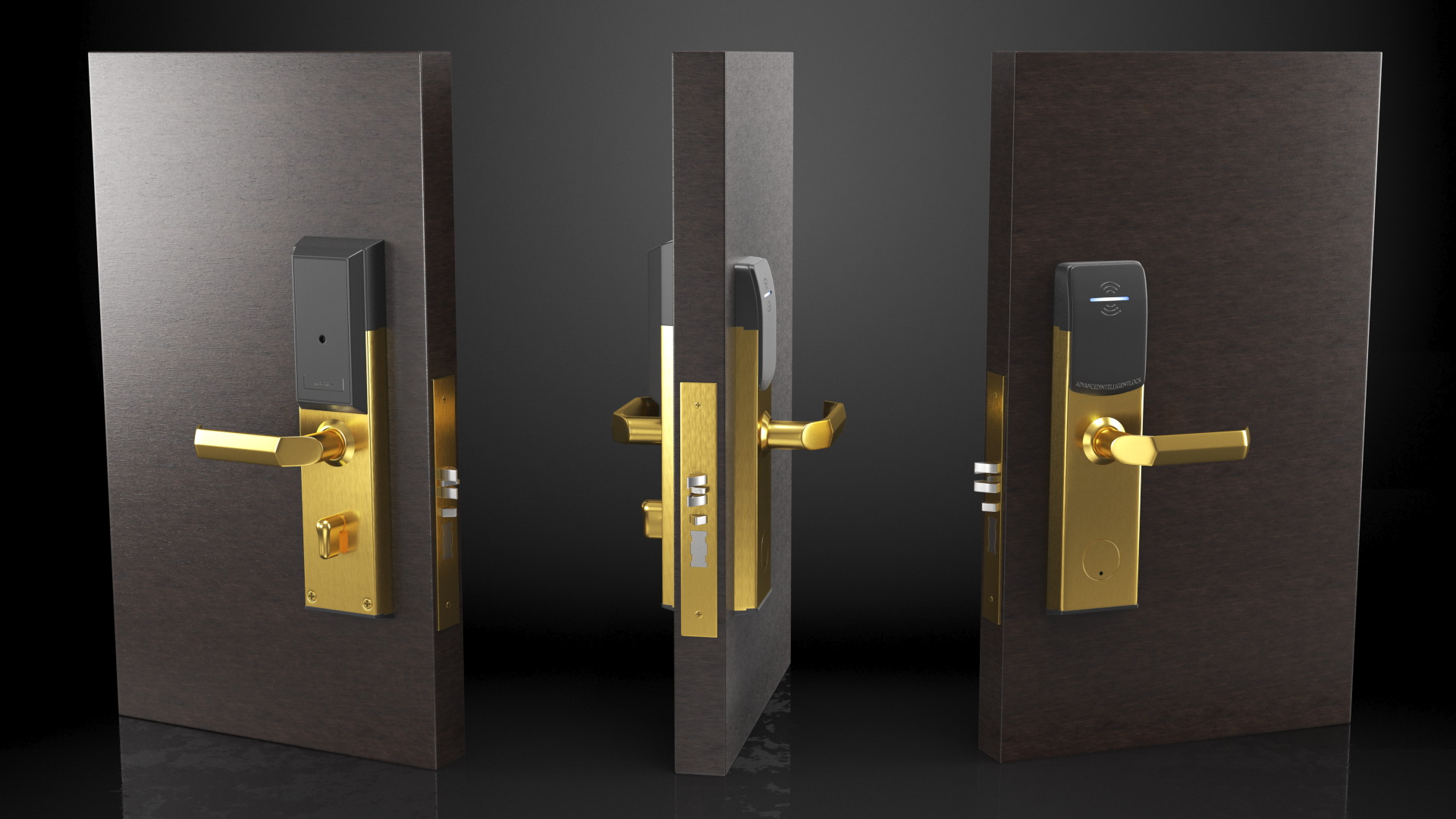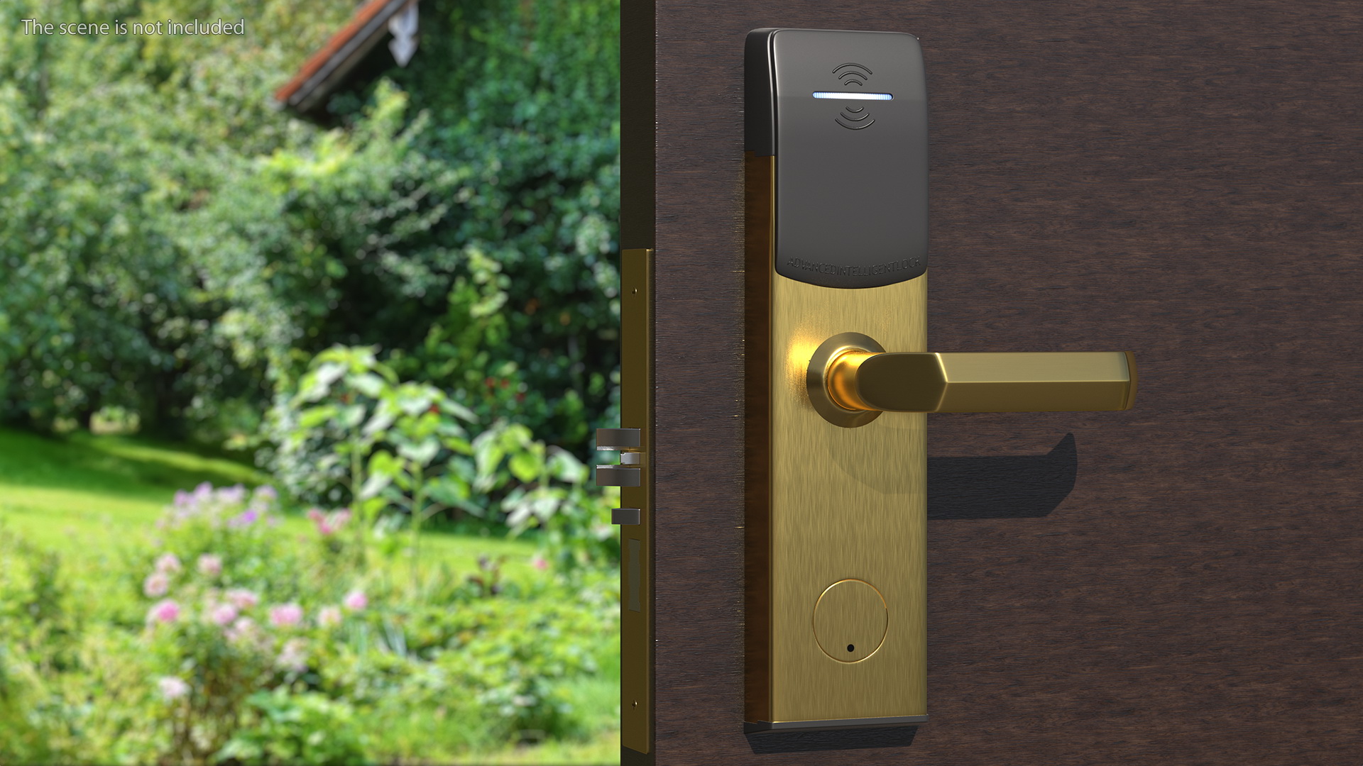 Smart RFID Hotel Door Lock Gold is a three-dimensional model of an electronical WiFi control hotel door lock, which is smart hi-tech device.