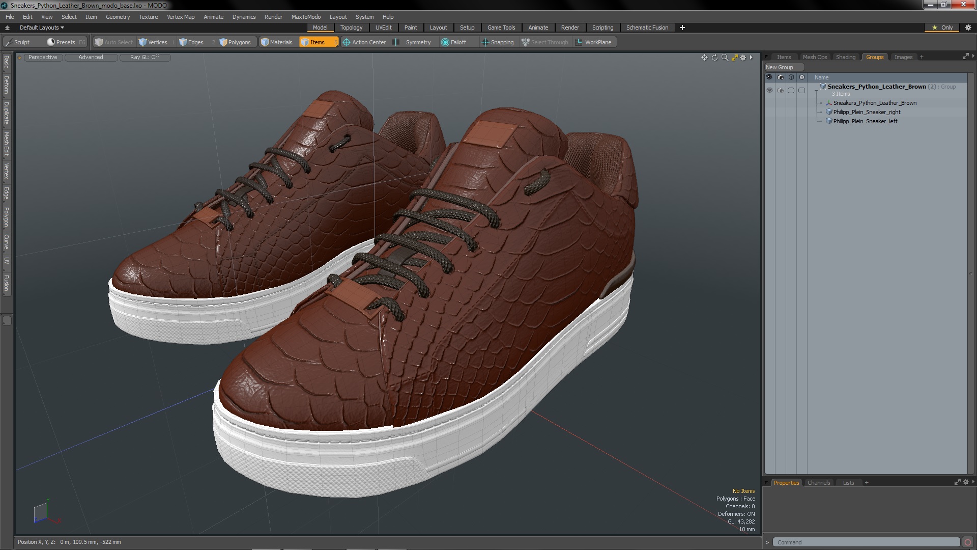 Sneakers Python Leather Brown is a high quality, photo real 3d model that will enhance detail and realism to any of your rendering projects. The model has a fully textured, detailed design that allows for close-up renders, and was originally modeled in 3ds Max 2020 and rendered with V-Ray. Renders have no postprocessing!