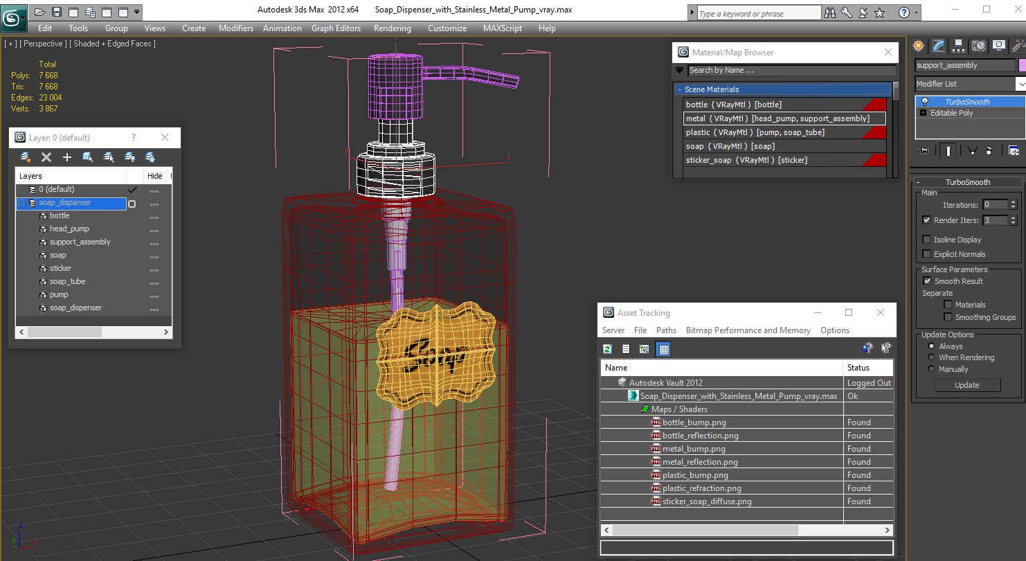 Soap Dispenser with Stainless Metal Pump is a high quality, photo real 3d model that will enhance detail and realism to any of your rendering projects. The model has a fully textured, detailed design that allows for close-up renders, and was originally modeled in 3ds Max 2020 and rendered with V-Ray. Renders have no postprocessing!