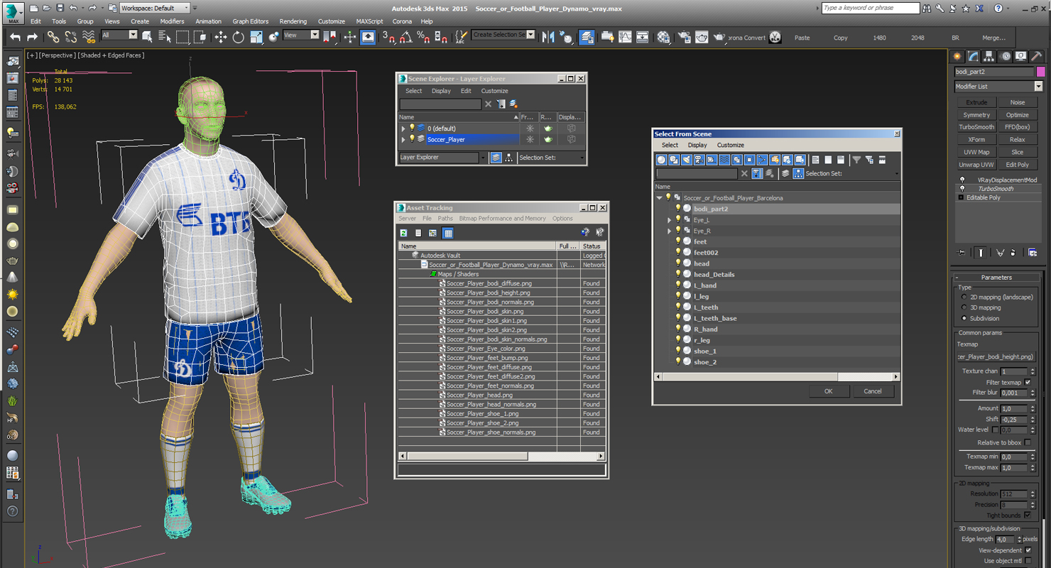 Soccer or Football Player Dynamo is a high quality, photo real 3d model that will enhance detail and realism to any of your rendering projects. The model has a fully textured, detailed design that allows for close-up renders, and was originally modeled in 3ds Max 2020 and rendered with V-Ray. Renders have no postprocessing!