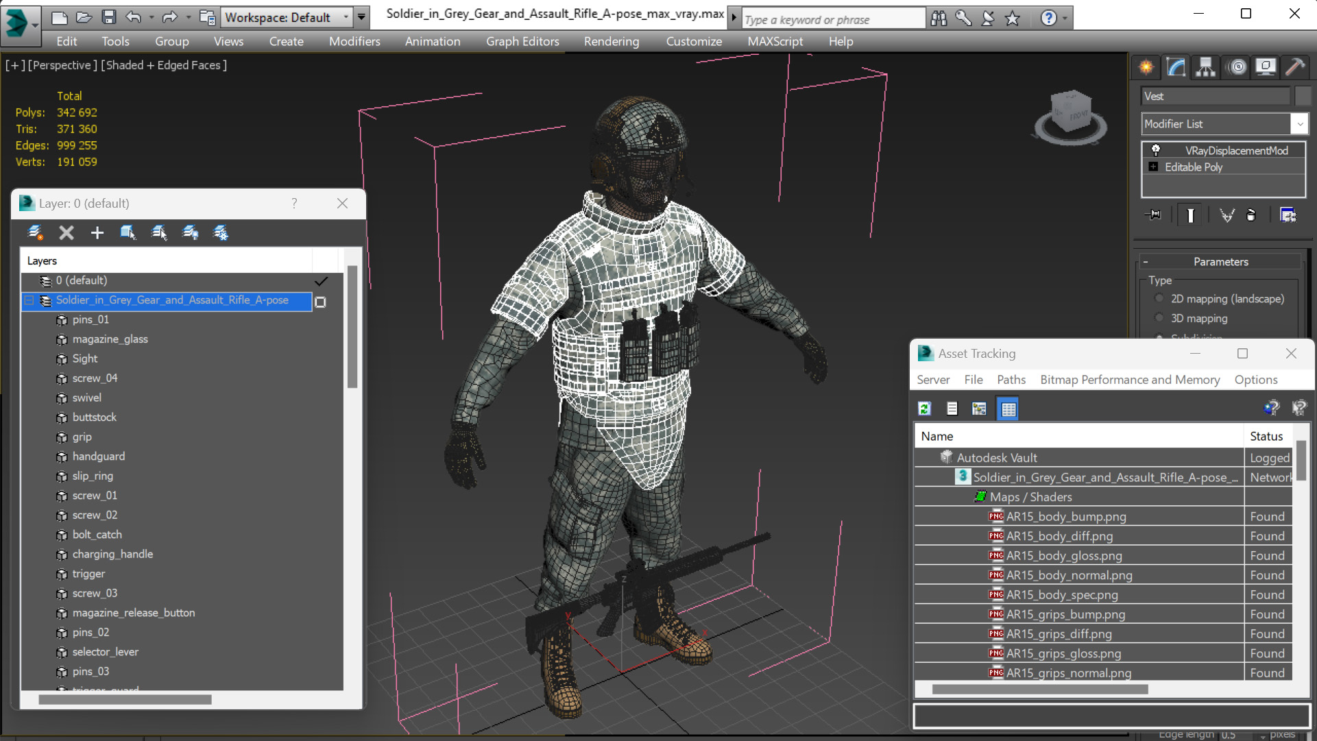 Soldier in Grey Gear and Assault Rifle A-pose is a high quality, photo real 3d model that will enhance detail and realism to any of your rendering projects. The model has a fully textured, detailed design that allows for close-up renders, and was originally modeled in 3ds Max 2020 and rendered with V-Ray. Renders have no postprocessing!
