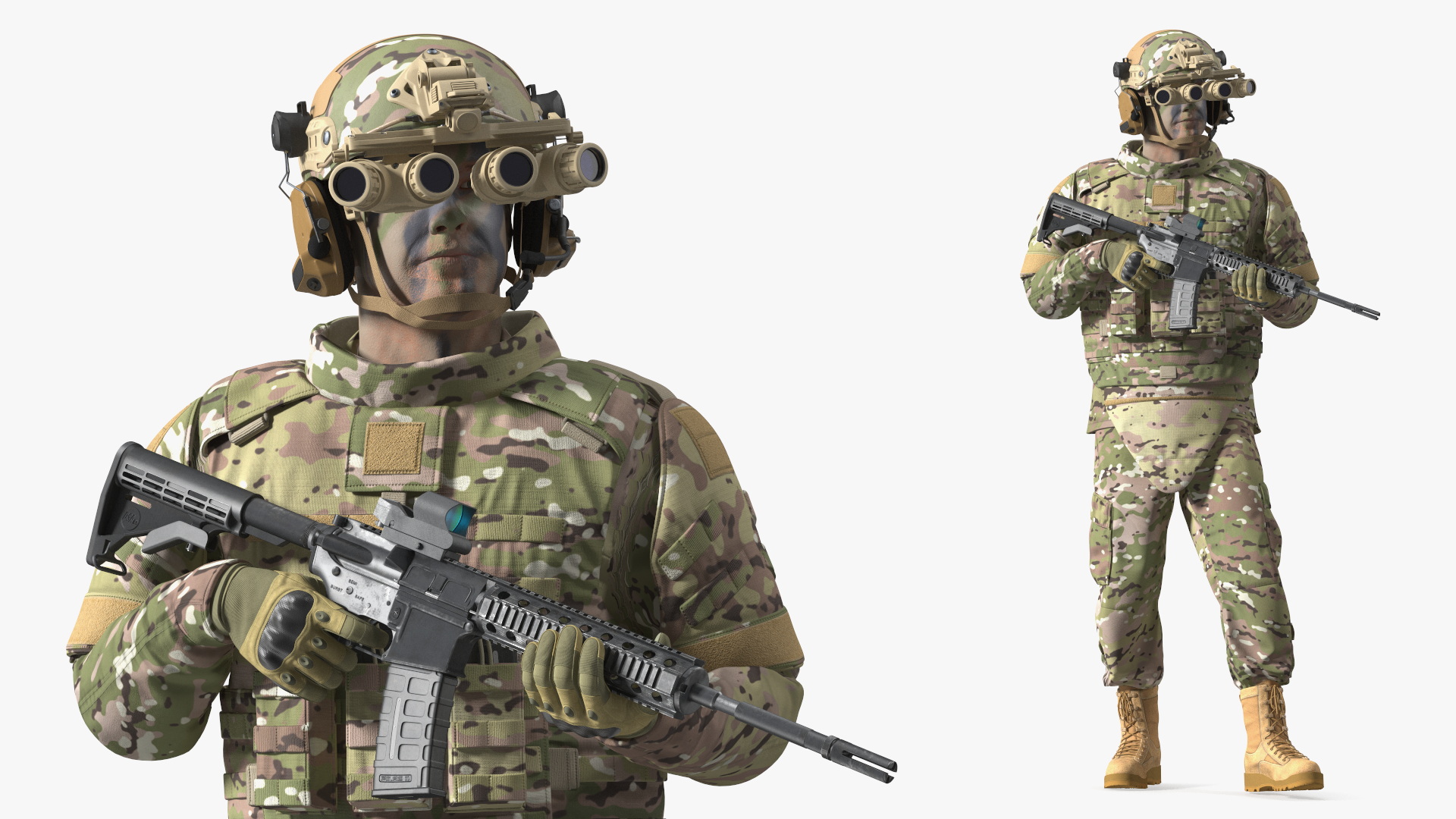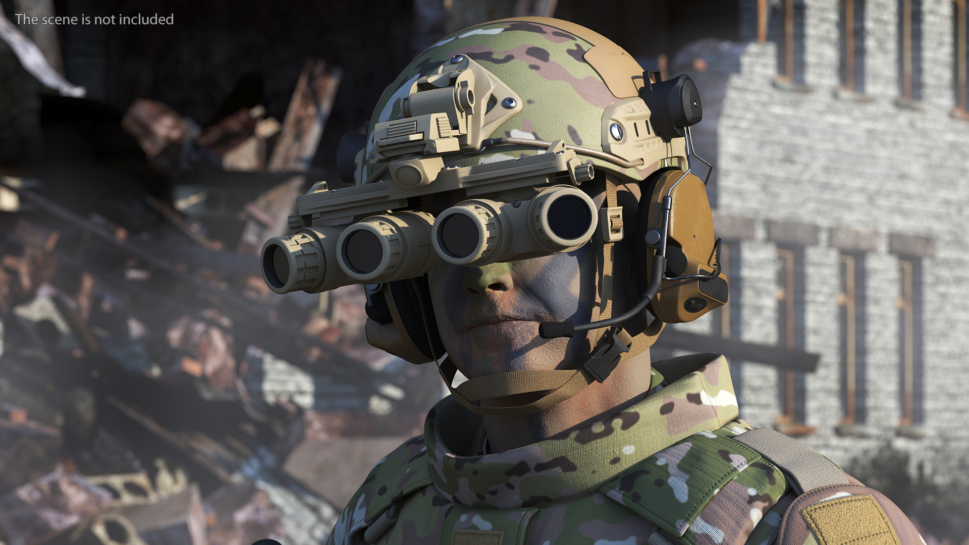 Soldier in Night Vision Goggles Green Camo Walking is a 3d model of military personnel equipped with night vision goggles that have a green camouflage pattern.