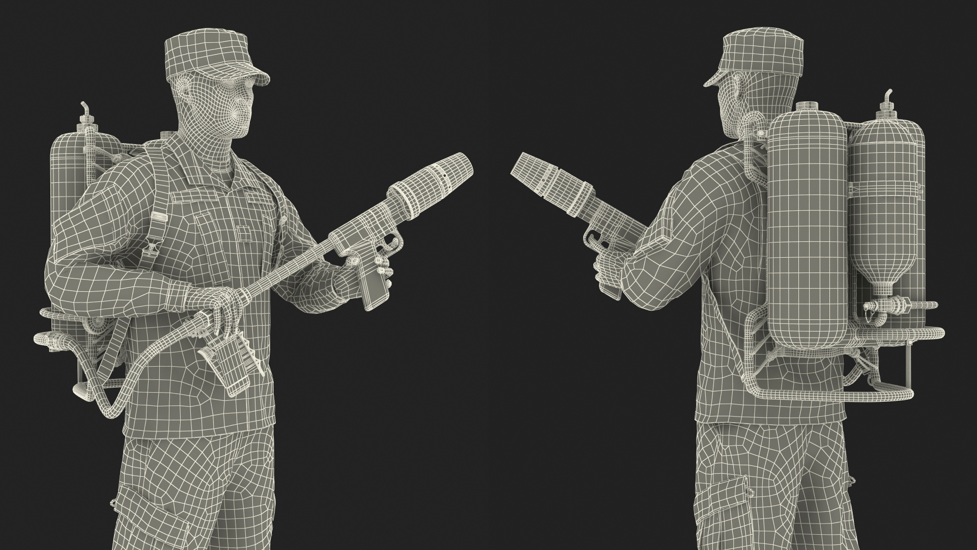 Soldier with M2 Flamethrower Backpack is a 3d model of soldier equipped with an M2 flamethrower that is a portable, self-contained weapon system that can project a stream of burning fuel at targets.