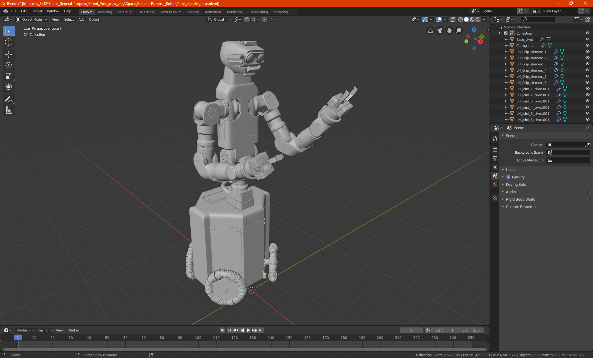 Space General-Purpose Robot Pose is a high quality, photo real 3d model that will enhance detail and realism to any of your rendering projects. The model has a fully textured, detailed design that allows for close-up renders, and was originally modeled in 3ds Max 2020 and rendered with V-Ray. Renders have no postprocessing!