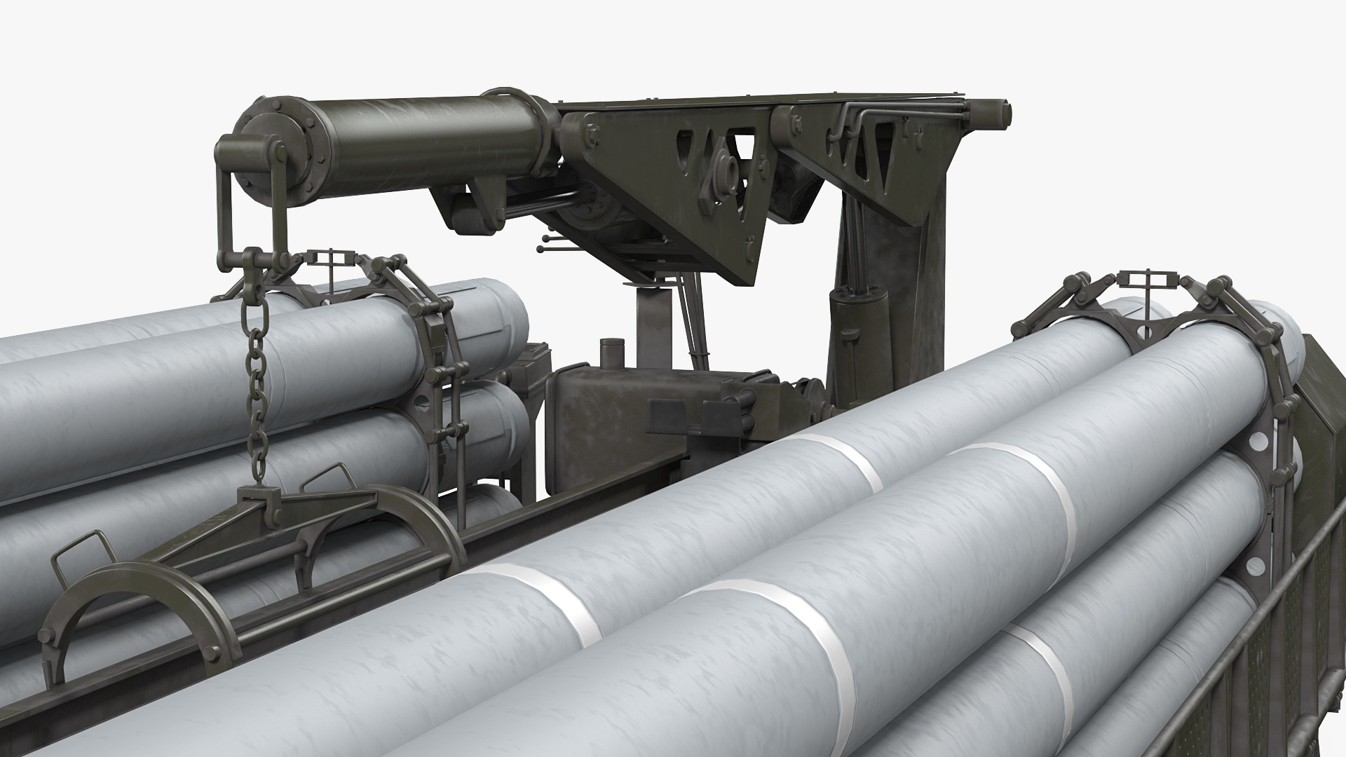 A military rocket missile or projectile launcher component with a special rocket loader crane and spare surface-to-surface rockets.