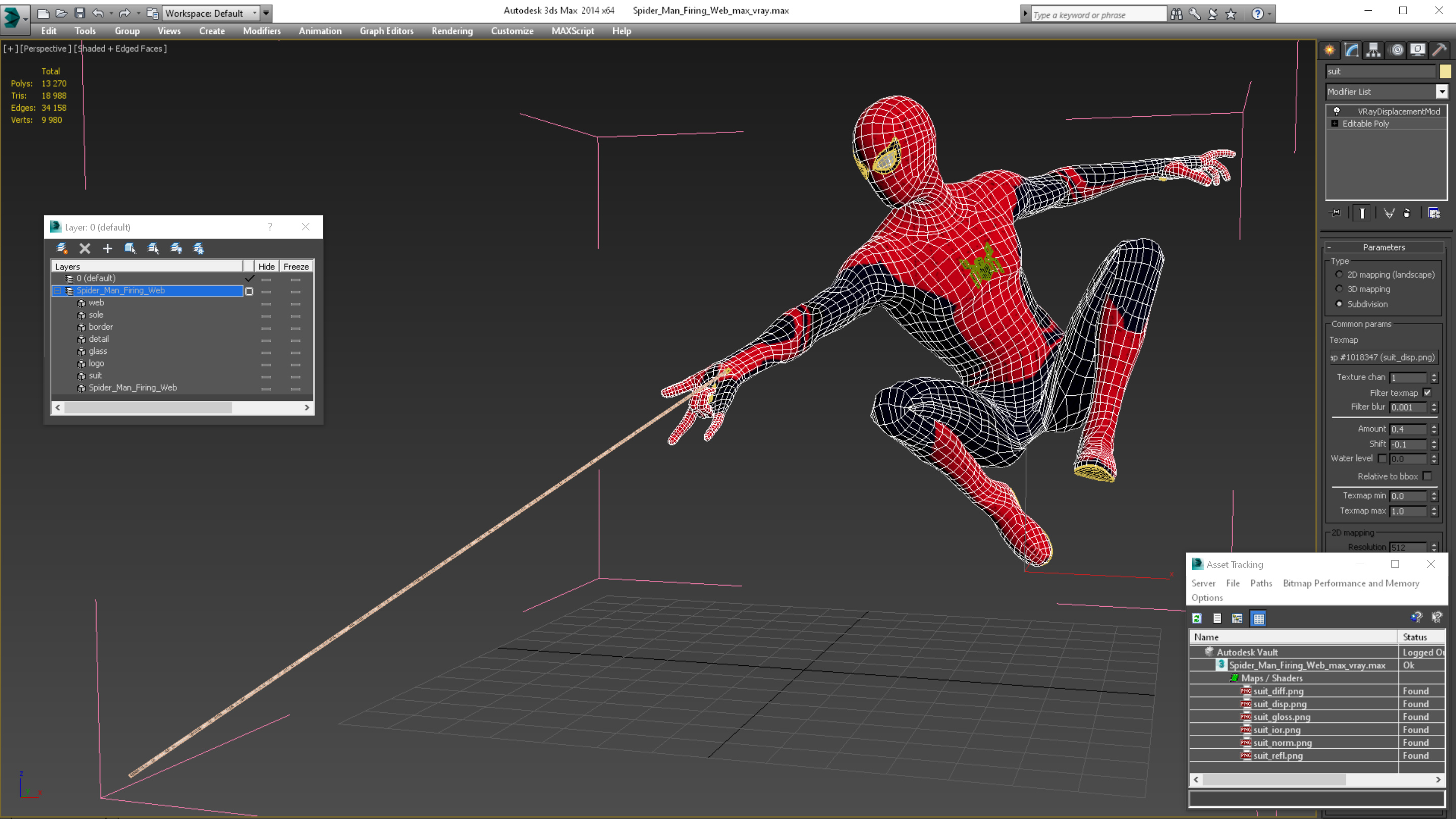 Spider Man Firing Web is a high quality, photo real 3d model that will enhance detail and realism to any of your rendering projects. The model has a fully textured, detailed design that allows for close-up renders, and was originally modeled in 3ds Max 2020 and rendered with V-Ray. Renders have no postprocessing!