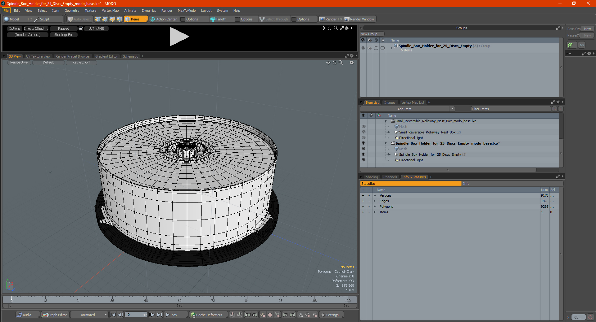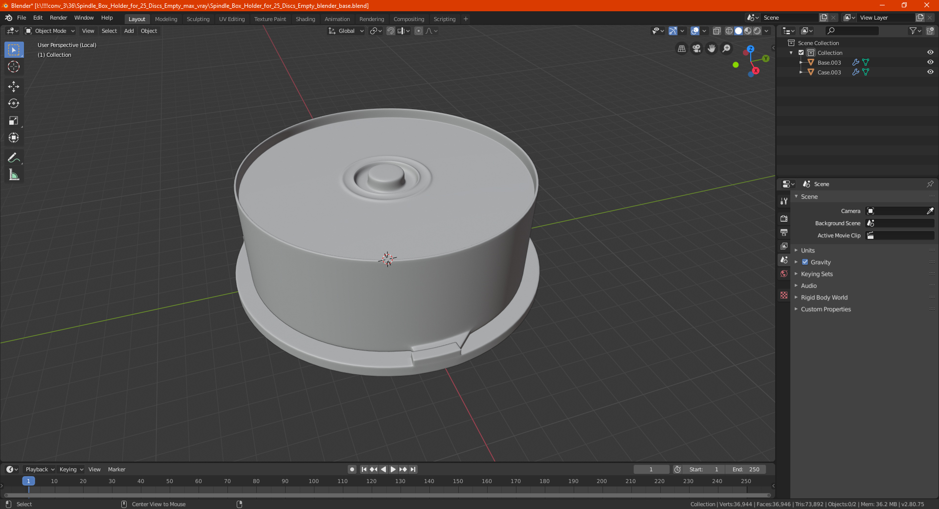 Spindle Box Holder for 25 Discs Empty is a high quality, photo real 3d model that will enhance detail and realism to any of your rendering projects. The model has a fully textured, detailed design that allows for close-up renders, and was originally modeled in 3ds Max 2020 and rendered with V-Ray. Renders have no postprocessing!